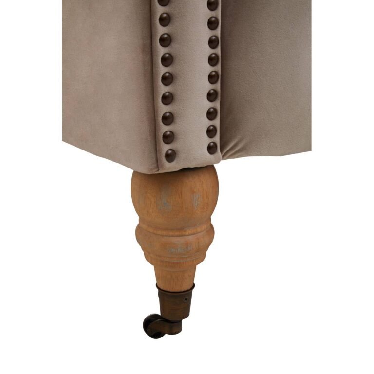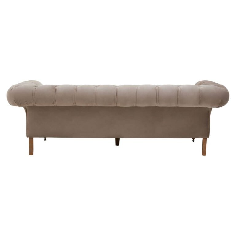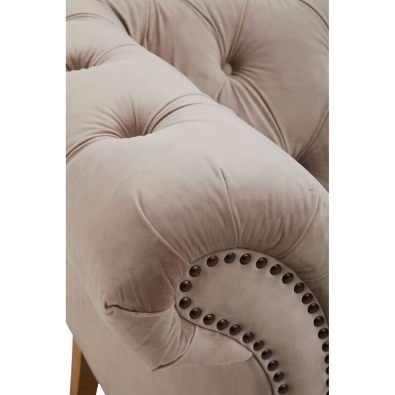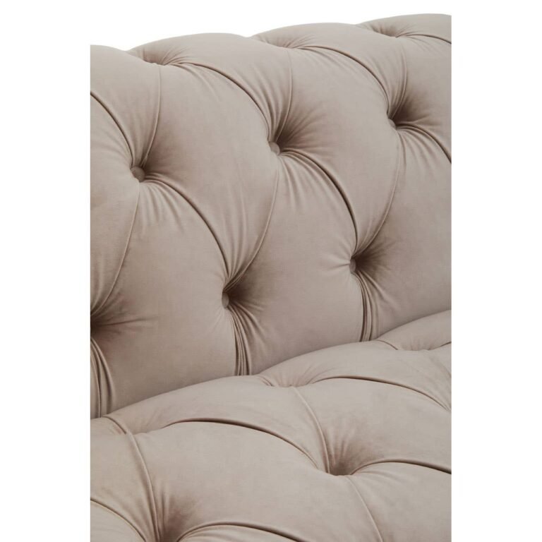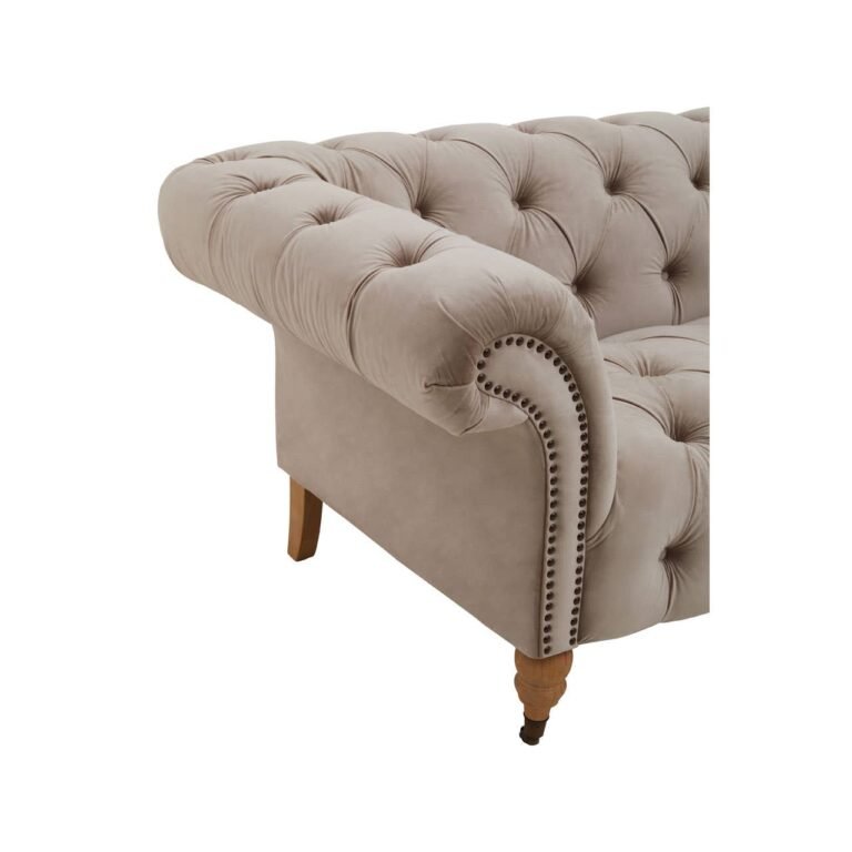 Covered in natural velvet, this sofa creates visual interest with gently rolled vintage style arms. Deep button tufting contributes to classic chesterfield design supported with rolling casters adding style and stability.
