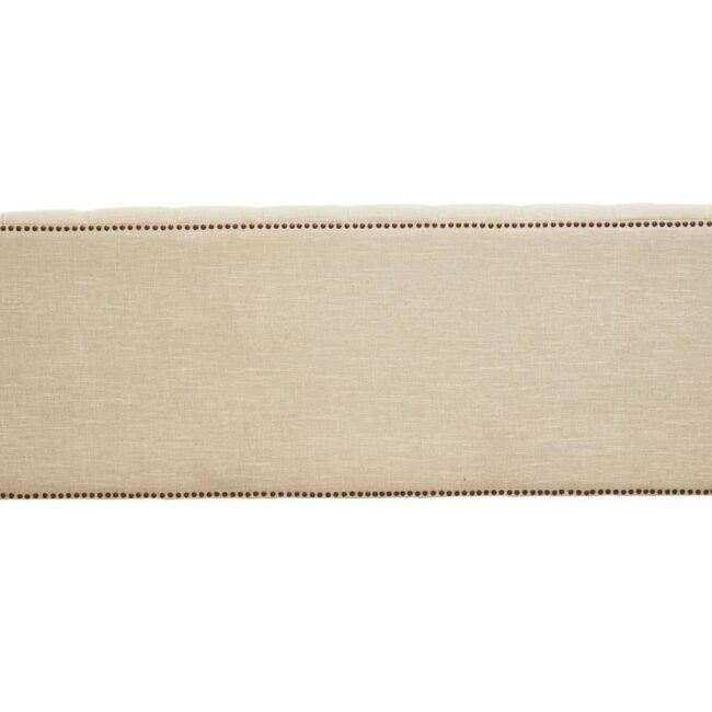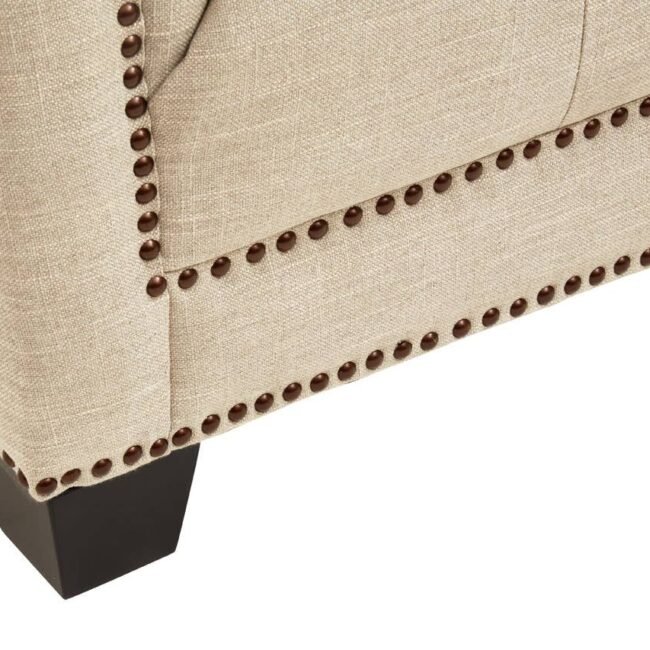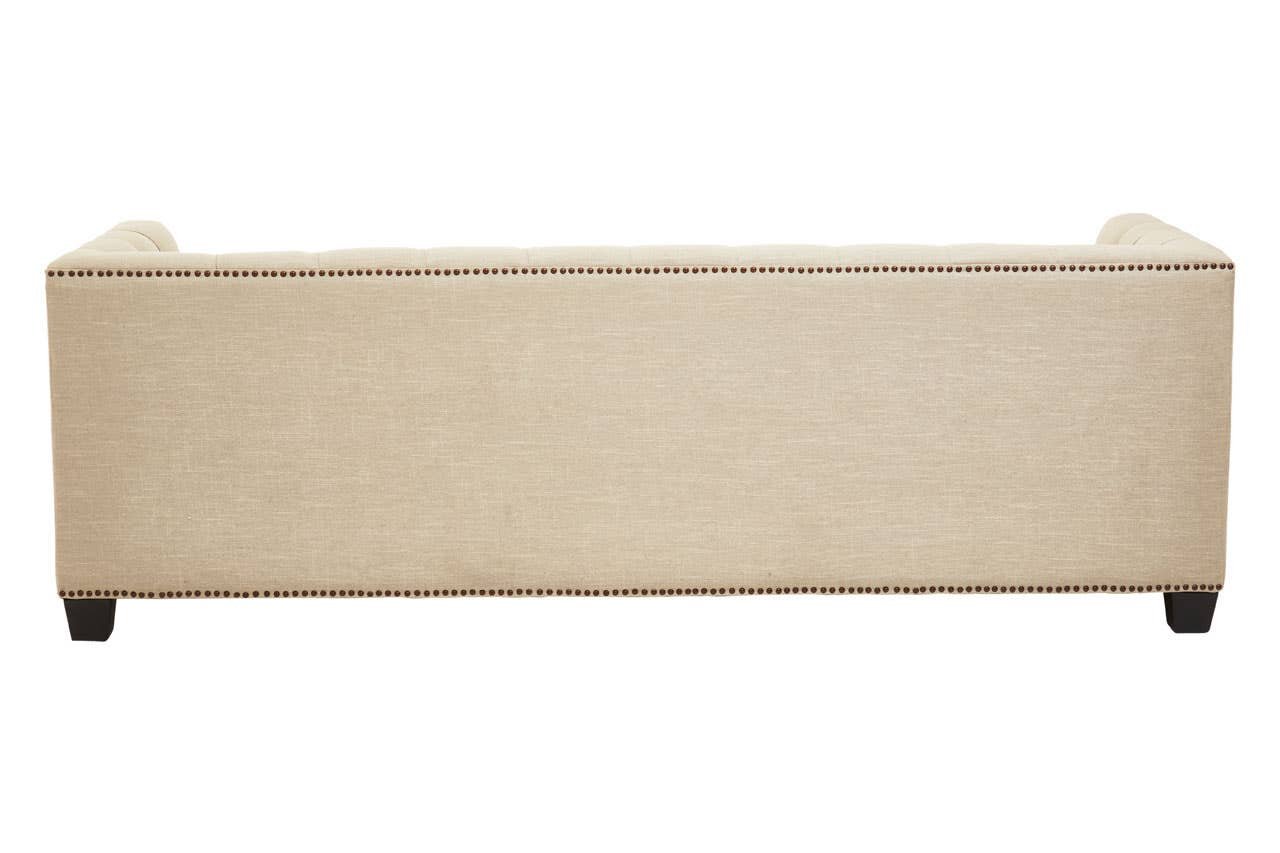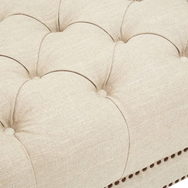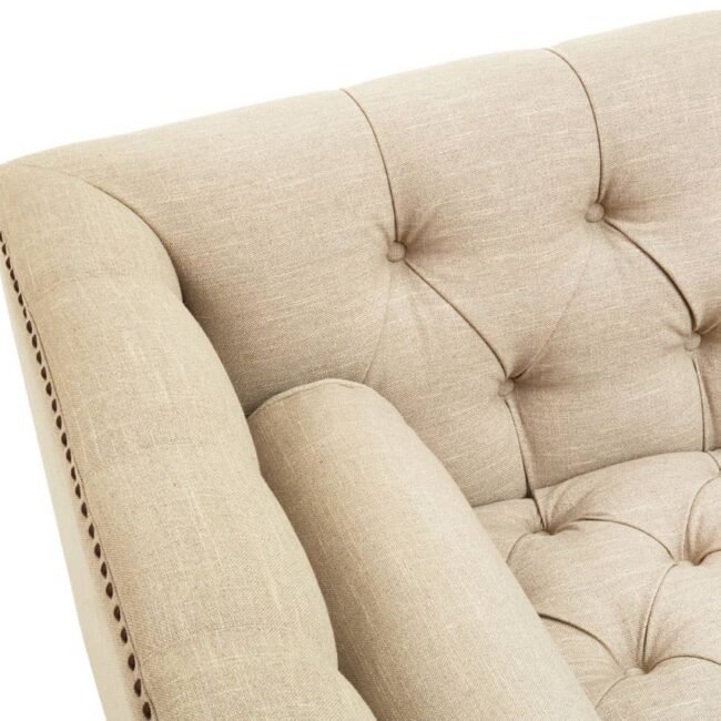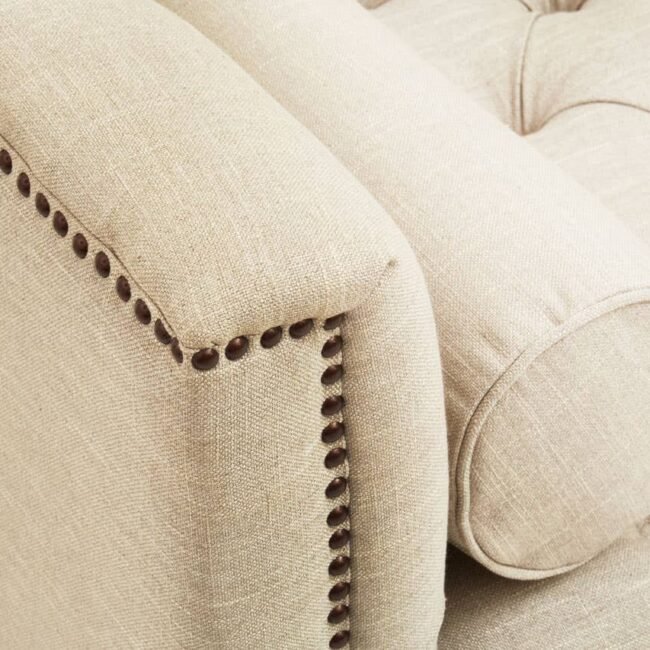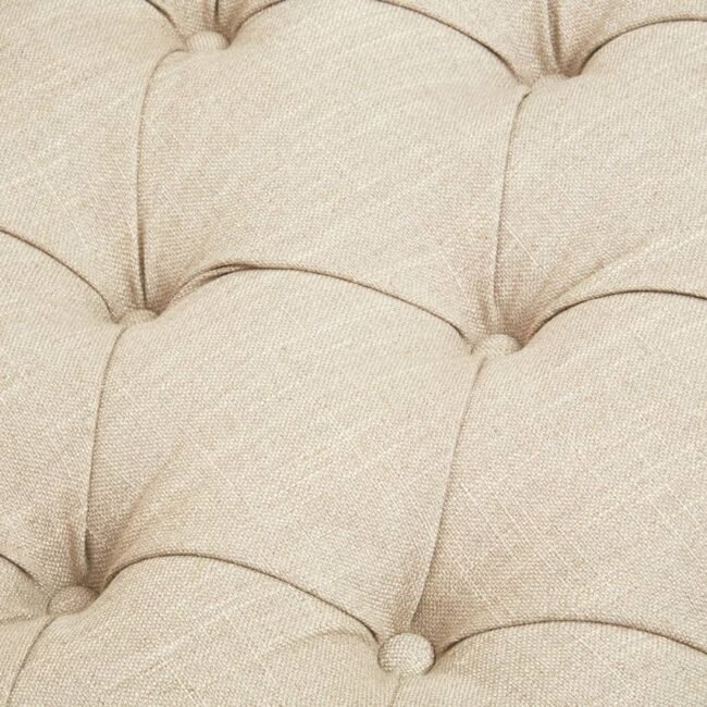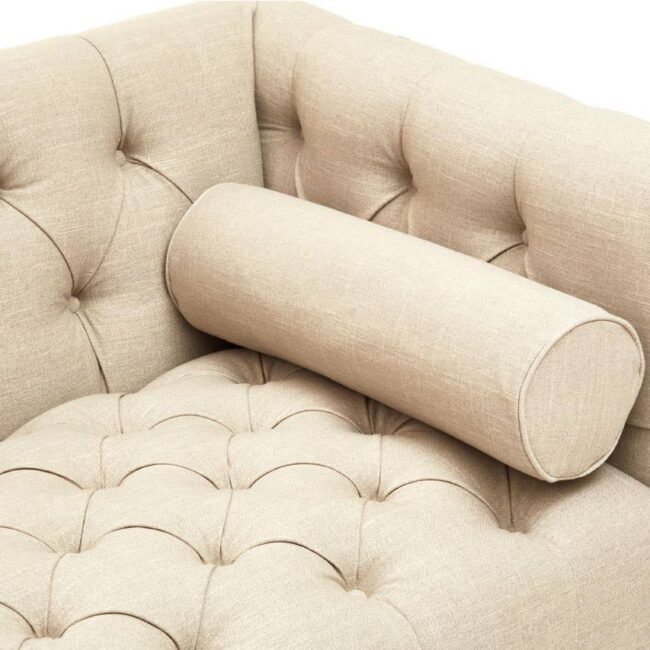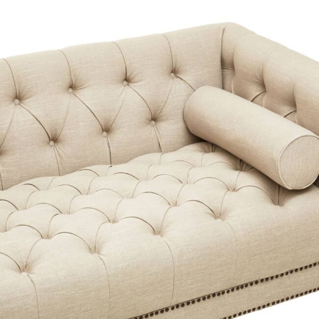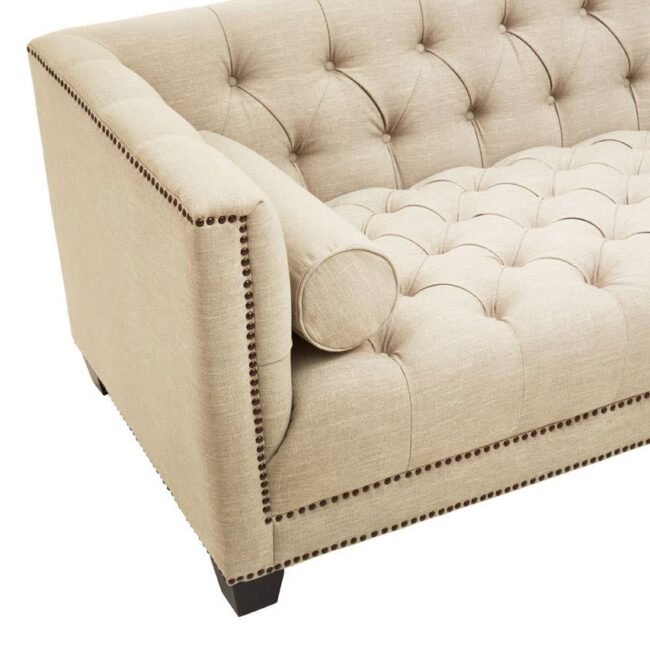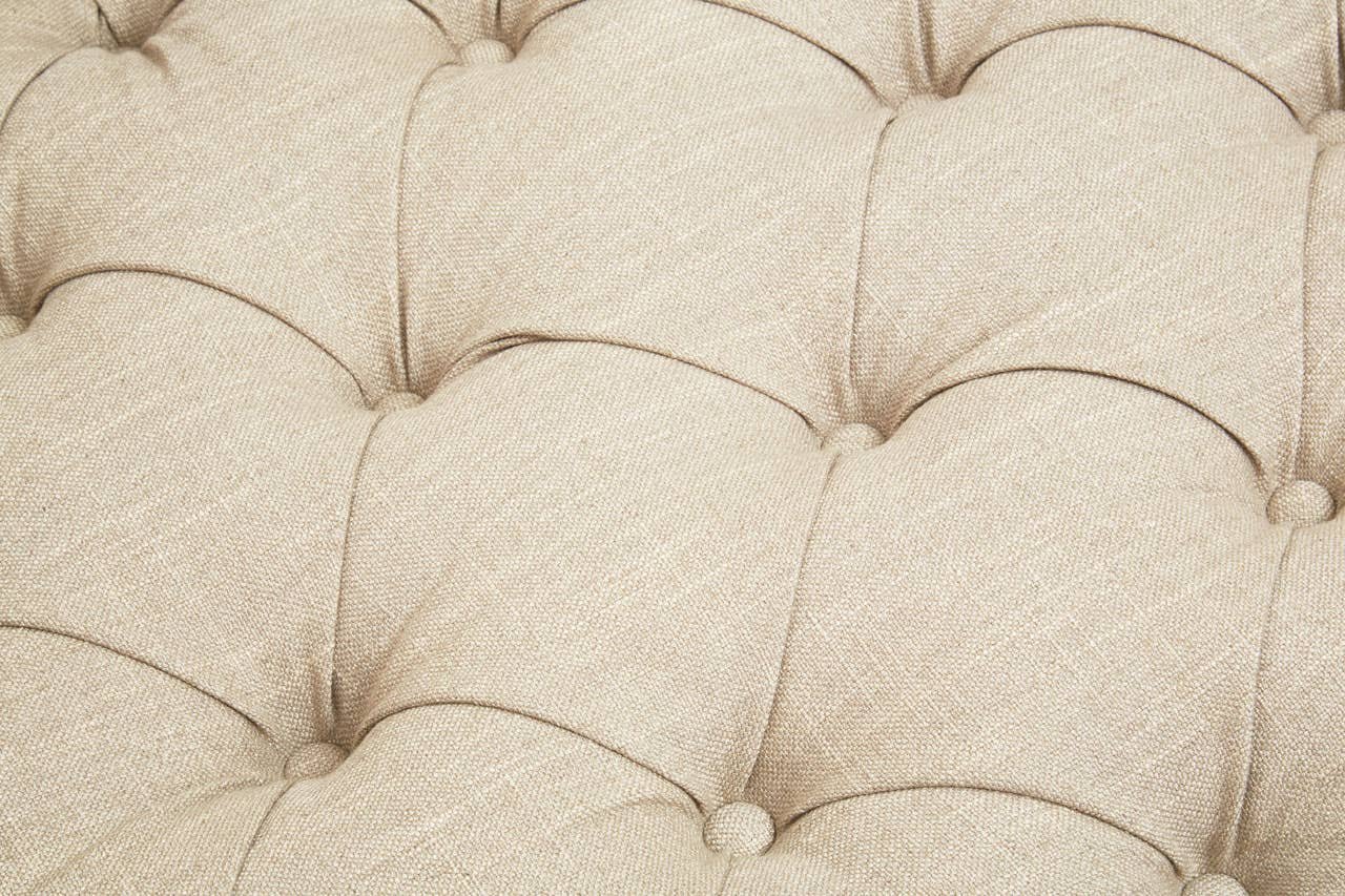 This three seat sofa is upholstered in stone fabric with button tufted detail that keeps it tight and firm. Featuring a low back, parallel arms and rolled cushions, the design is complete with elegantly carved wooden feet.