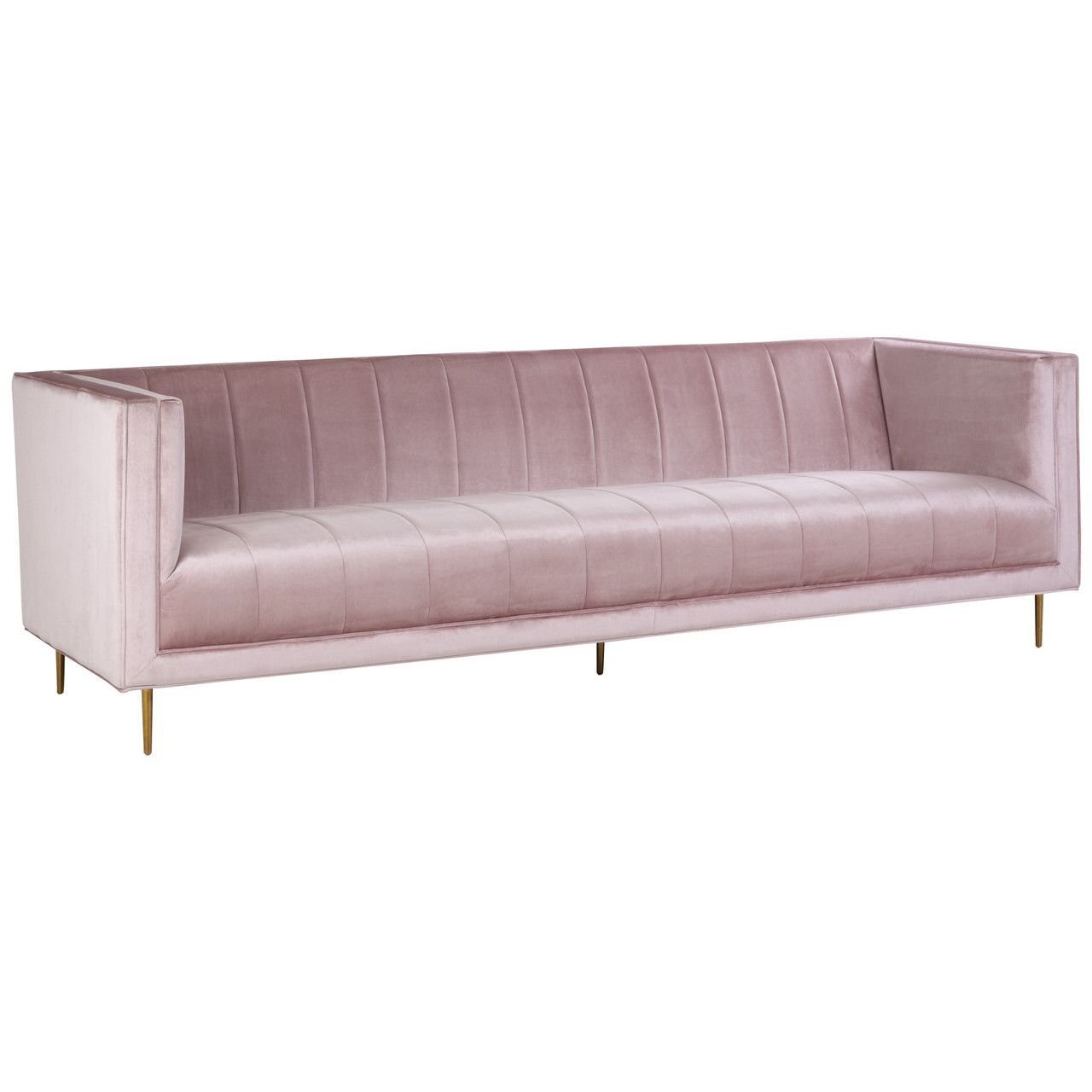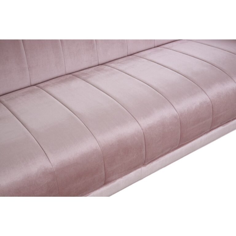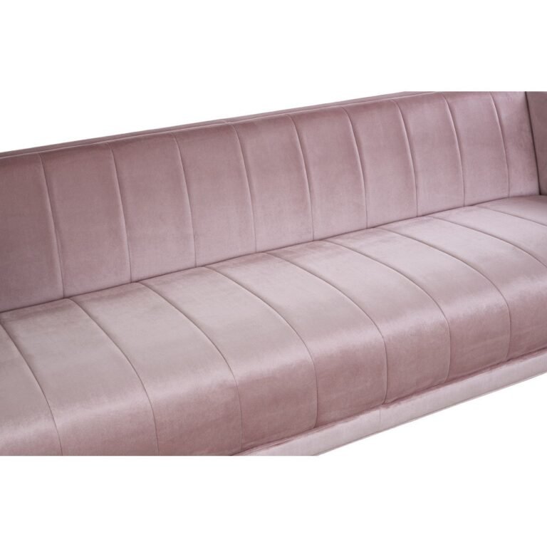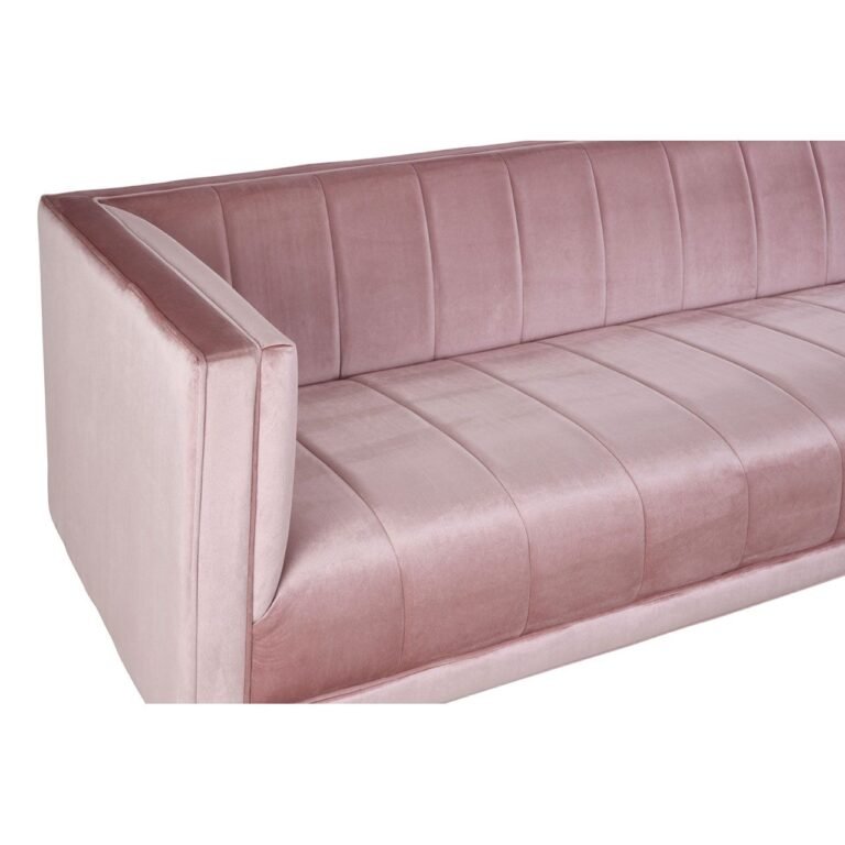 Upholstered in Ortili 3 Seat Pink Sofa, this three-seater sofa comes in thick padding featuring minimal channel detail. The warm metallic stainless-steel base furthers the luxe accent and harmonizes with vertical lines along with the seat and backrest.