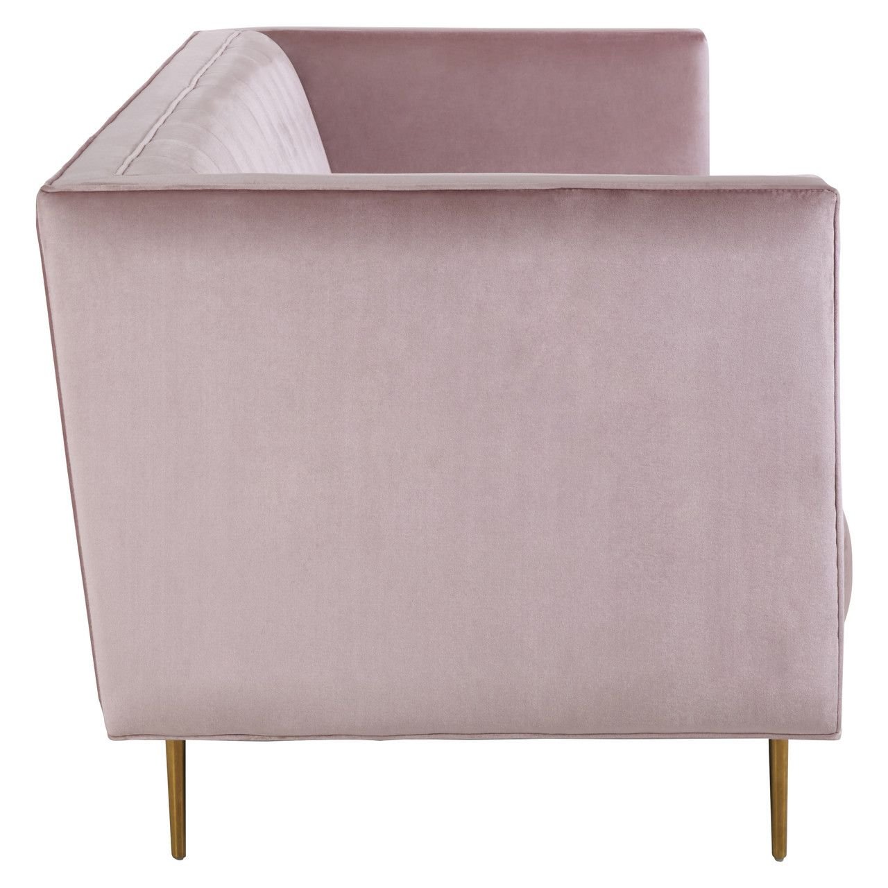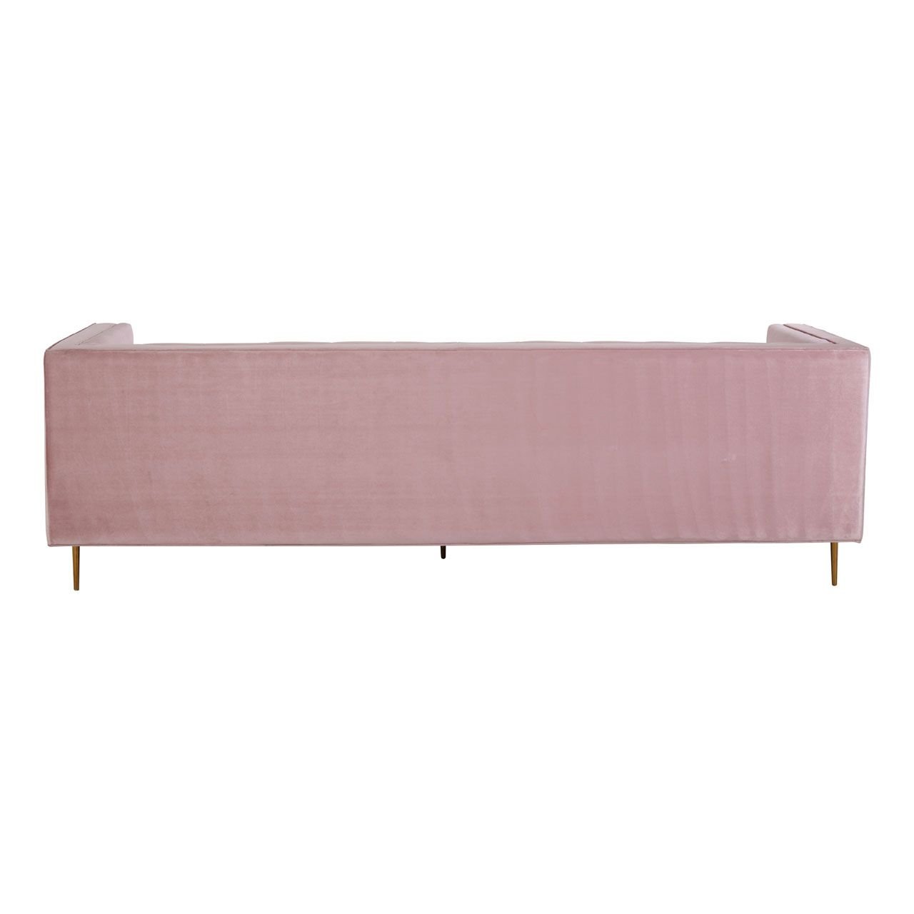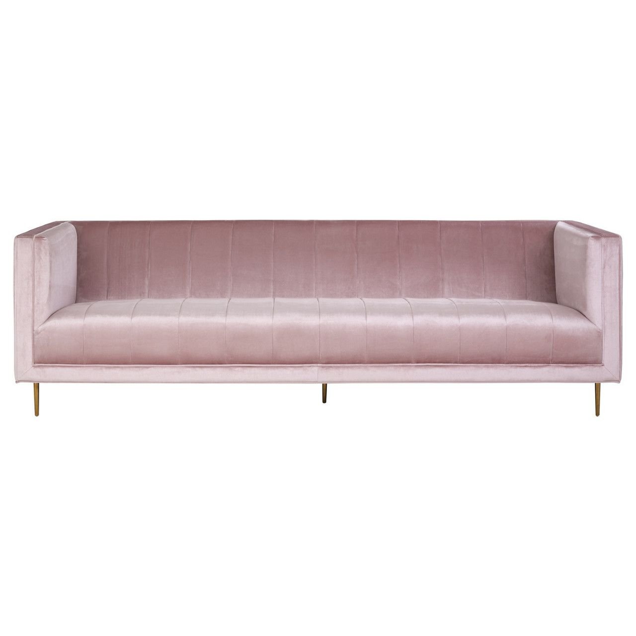 Upholstered in Ortili 3 Seat Pink Sofa, this three-seater sofa comes in thick padding featuring minimal channel detail. The warm metallic stainless-steel base furthers the luxe accent and harmonizes with vertical lines along with the seat and backrest.