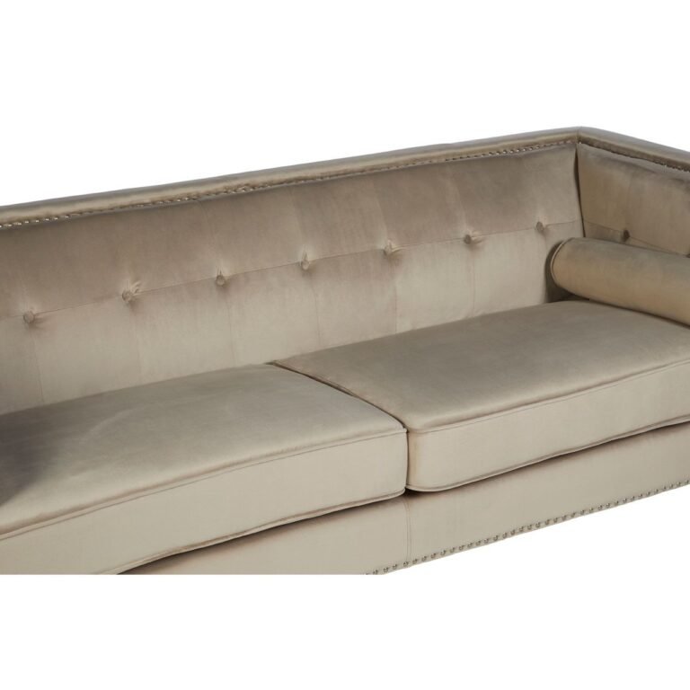 Salisa 3 Seat Mink Velvet Sofa: Neutral mink velvet upholstery gives the sofa a soft and luxurious feel, with shallow button tufting lending a decorative touch to the backrest. The stylish sofa has a square, angular design that is accentuated by silver finish metallic stud detailing. Two cylindrical cushions rest at each side, enhancing the elegant appeal of the sofa.