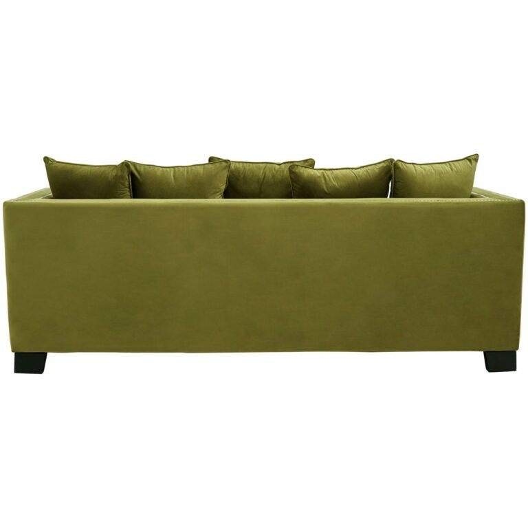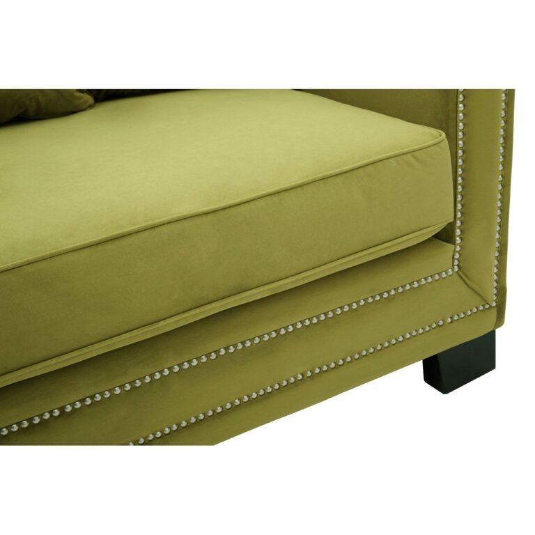 Stonemere 3 Seat Sofa: Upholstered in vibrant moss velvet, this three seater sofa features a thick padded seat complemented with matching cushions. It has a low profile backrest and raised armrests, adorned with metallic nailhead trim on the outer. Renewable rubberwood feet are coloured black to contrast with the distinctive fabric.