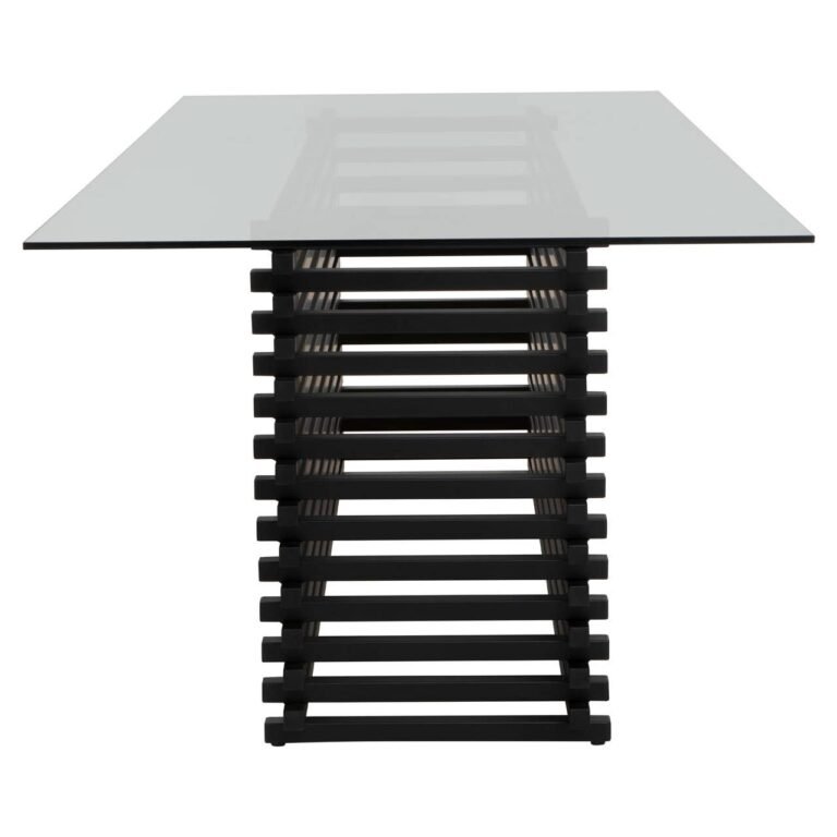 Aiste Matte Black Dining Table: The Aiste dining table has a strong art deco influence, with bold geometrical features balanced by a harmony between materials. The base is crafted from strong matte black stainless steel, supporting a large rectangular glass table top.