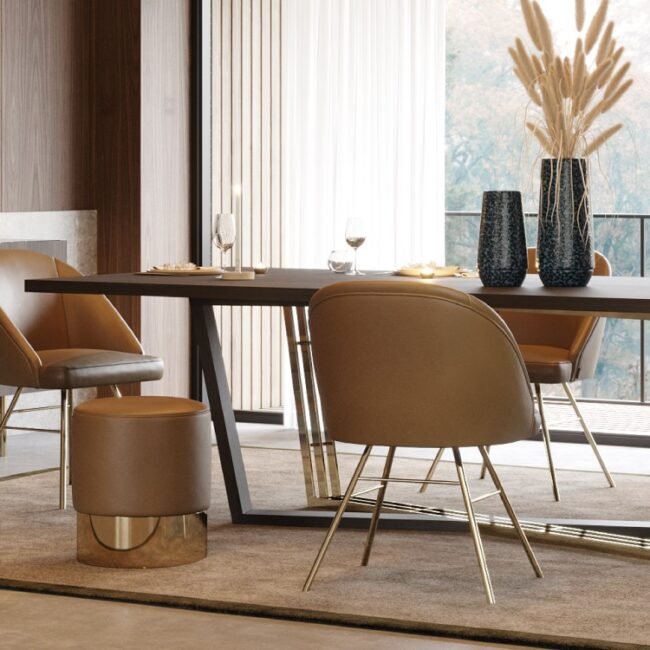 Alison dining table is a boundary-pushing creation, perfect for dining rooms with timeless glamour. The natural wooden countertop and metallic details make this table a majestic addition to any interior.