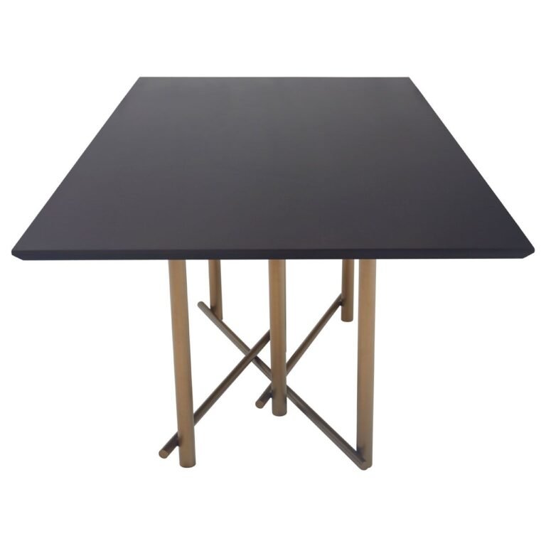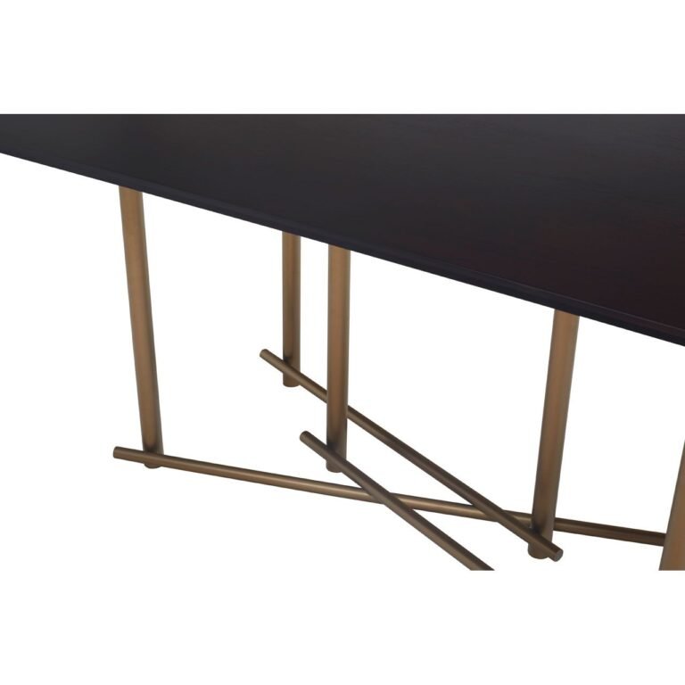 Timi Dining Table: A strong, dark wooden tabletop sits upon gold metallic legs, inter-connected at the base to form a geometric design. This dining table comfortably sits six guests.