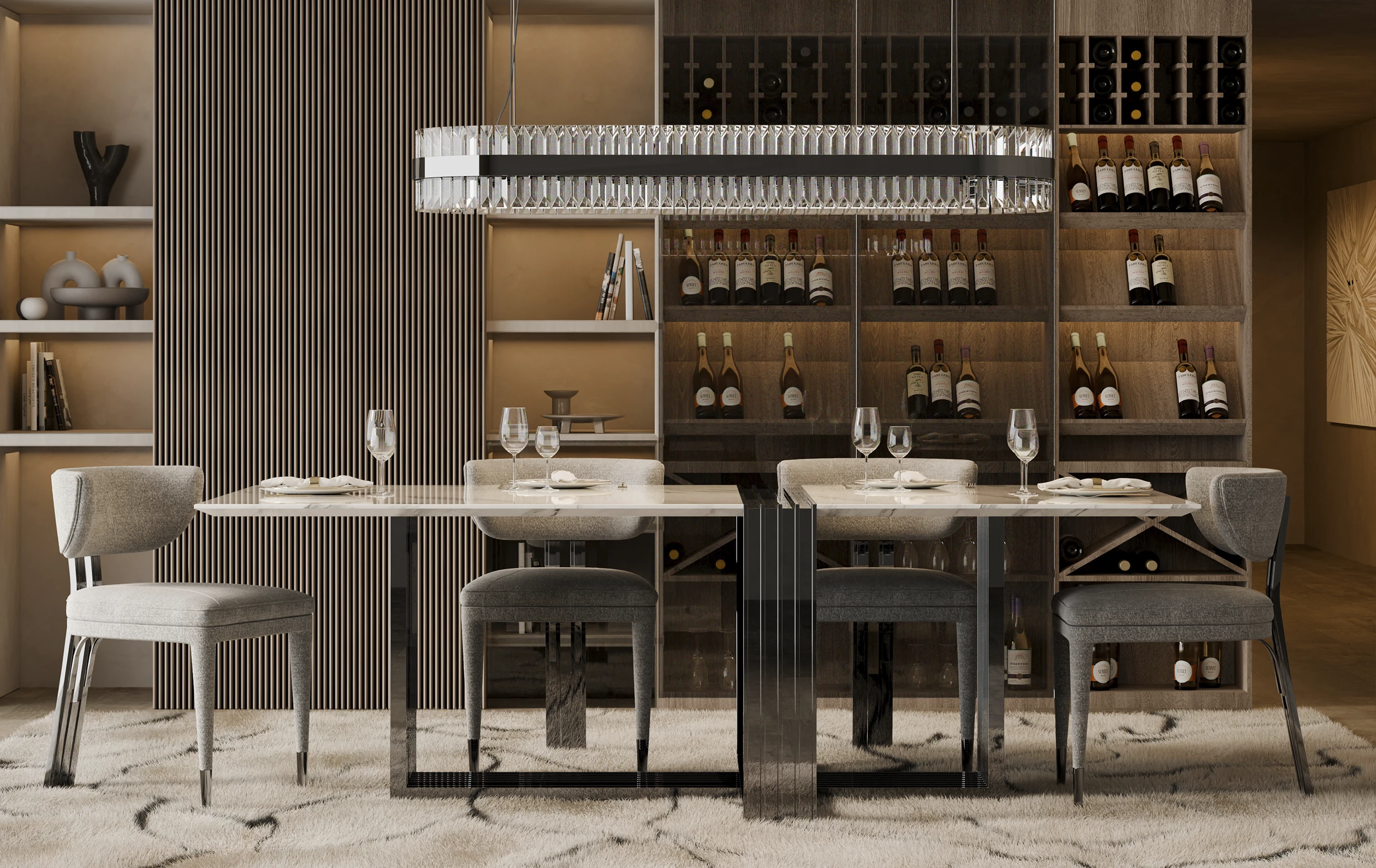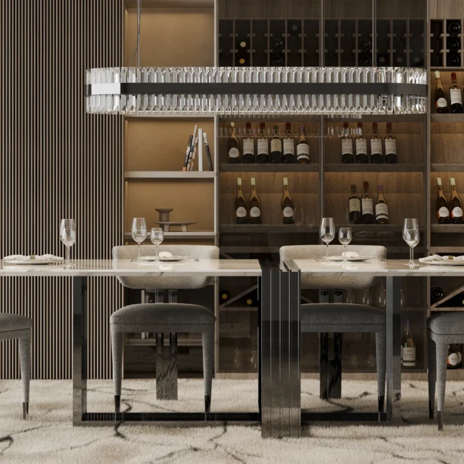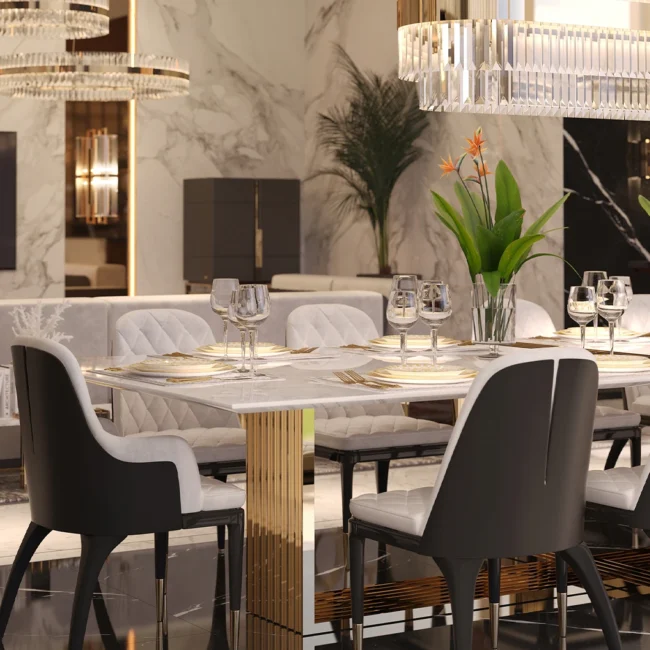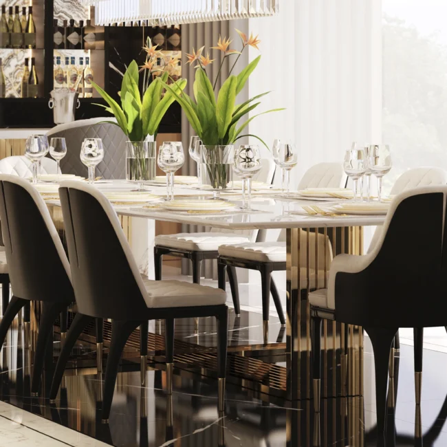 The Vertigo Dining Table is an impressive addition to the Vertigo collection. Made of Nero Marquina marble, this statement table becomes the focal point of any luxury dining setting. It creates a unique and captivating environment in any interior decor style.