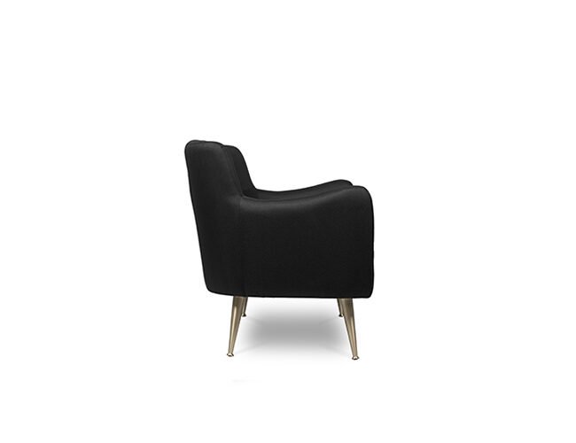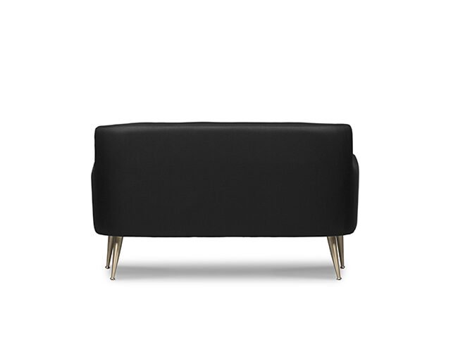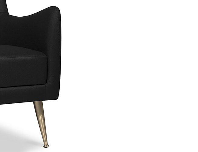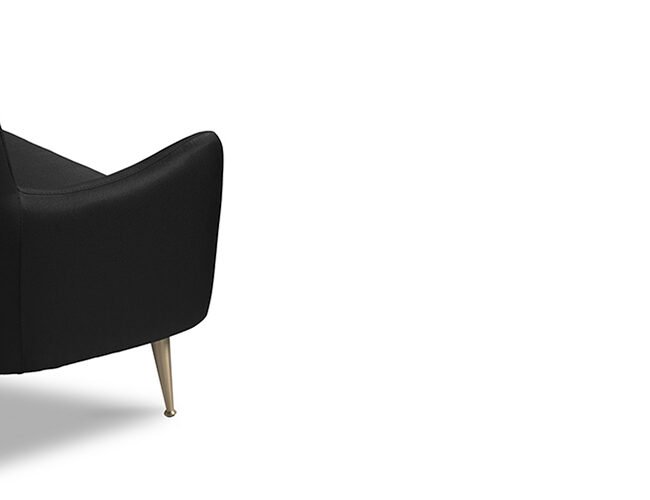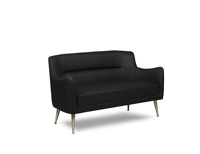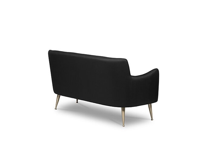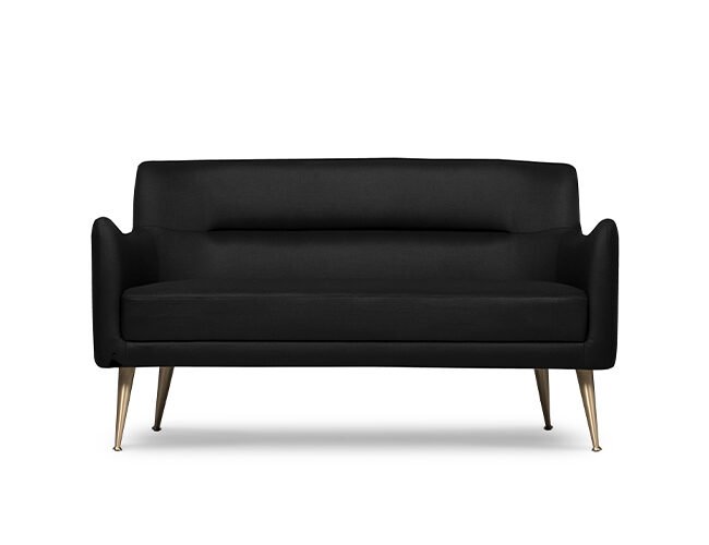 Dandridge is an organically shaped sofa that makes a statement through its accented and slightly sloping arms. It features tapered legs in polished brass, one of the best calling cards of mid-century modern furniture.