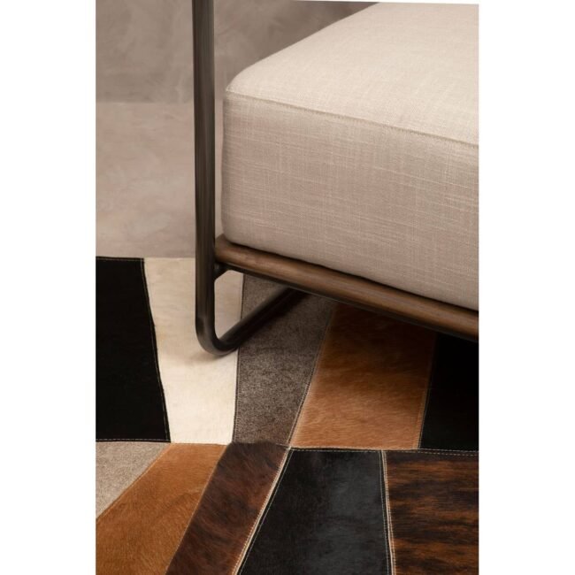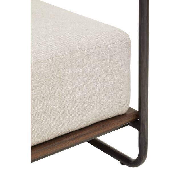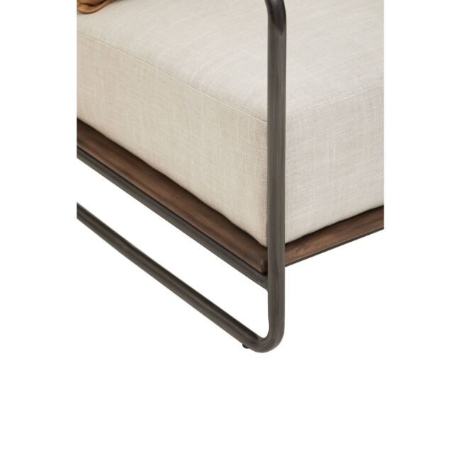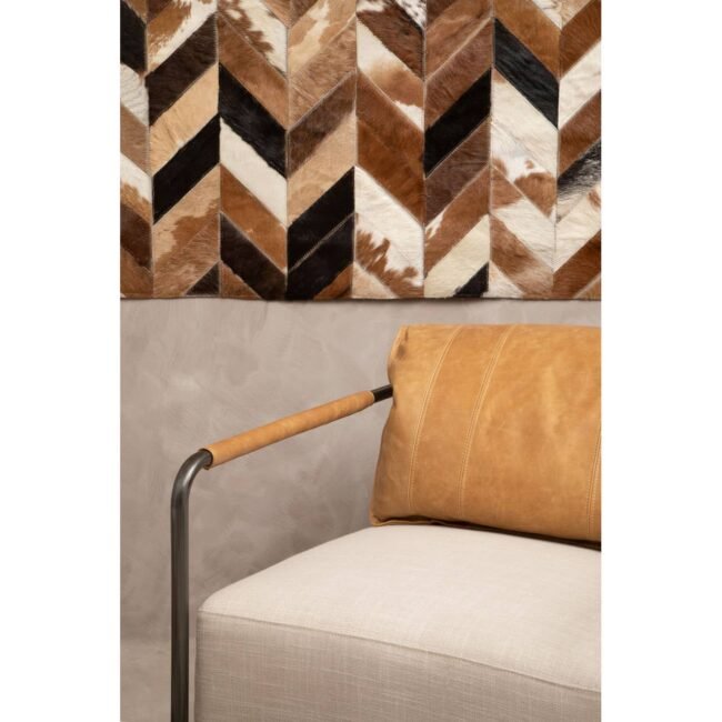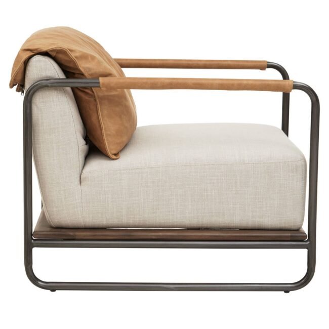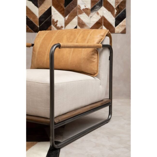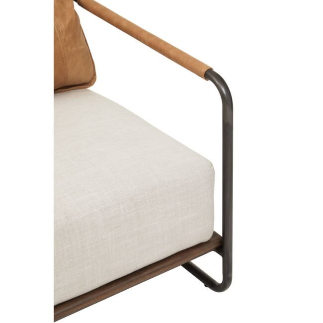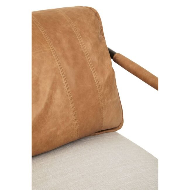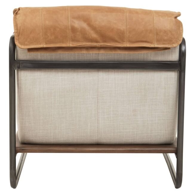 Featuring a clean and minimalist profile, this chair has a densely padded natural fabric seat that contrasts the pillow shaped back, covered in cognac leather. Sleek iron arms emerge from the high back and gently curve to form a sledge base.