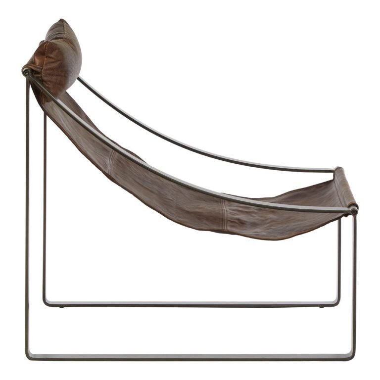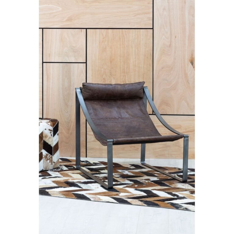 Albermarle Brown Leather Chair: Featuring a distinctive sling design, the contemporary Albermarle chair is upholstered in genuine brown leather, with a perforated leather headrest for additional comfort. The leathers prominent distressing enhances the factory-floor aesthetic of this accent piece. Coordinate with natural wood and cool metallic accents.