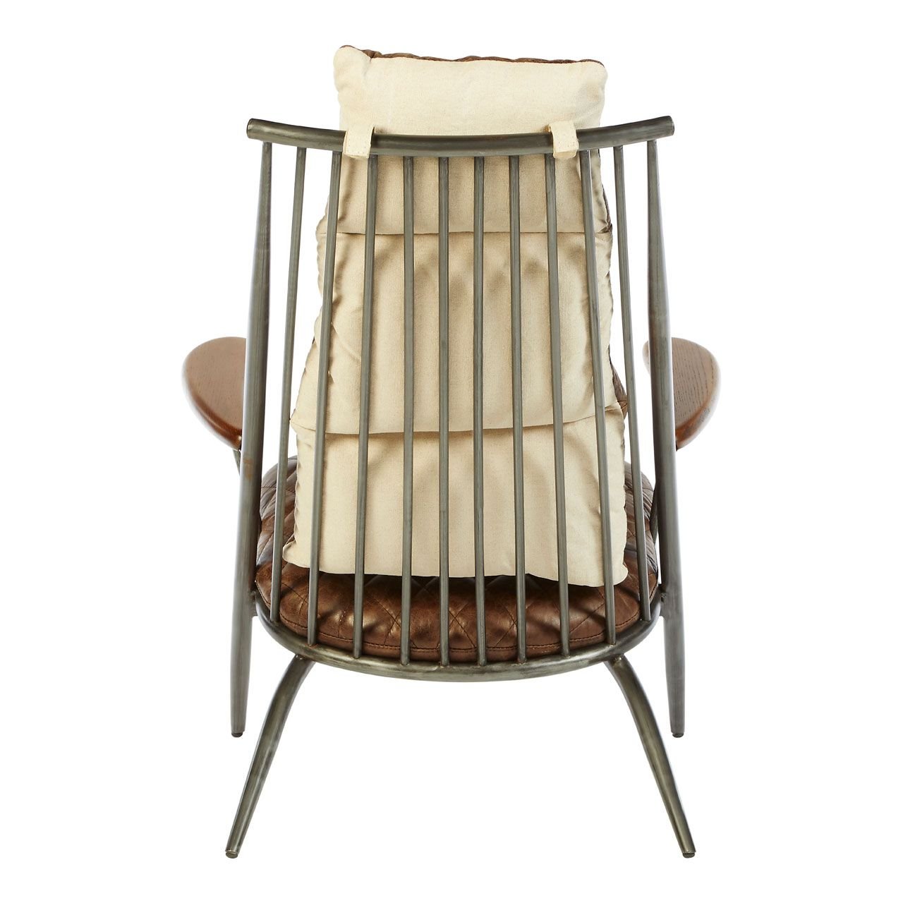 Albermarle Genuine Brown Leather Chair: The Albermarle cocktail chair is created from strong iron with a dark, subtly distressed finish. The slender metallic legs and backrest lend the chair to soft industrial style interiors. Tactile, curved ash wood armrests lend a natural accent to the metal frame and coordinate with the brown tones of the quilted leather upholstery.