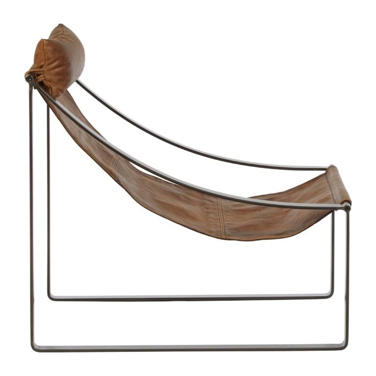 Albermarle Light Brown Leather Chair: Featuring a distinctive sling design, the contemporary Albermarle chair is upholstered in genuine light brown leather, with a perforated leather headrest for additional comfort. The leathers prominent distressing enhances the factory-floor aesthetic of this accent piece. Coordinate with natural wood and cool metallic accents.