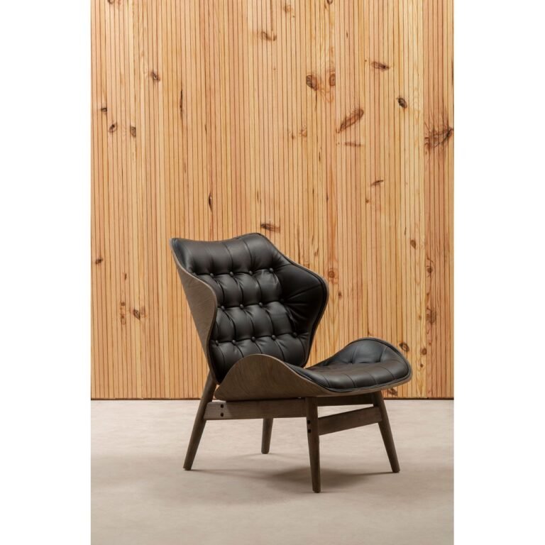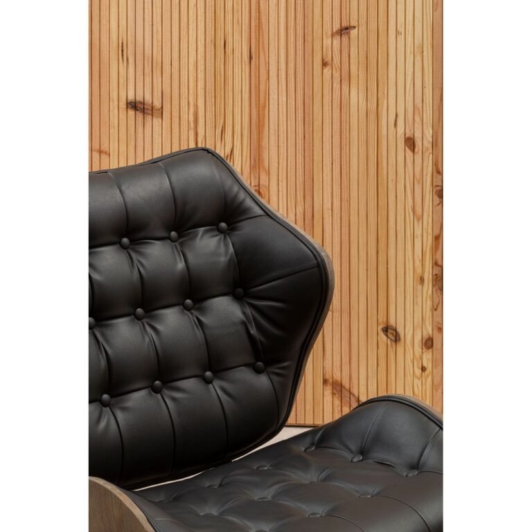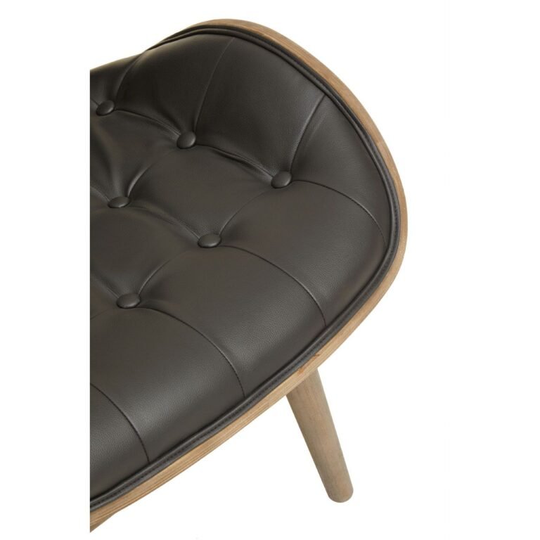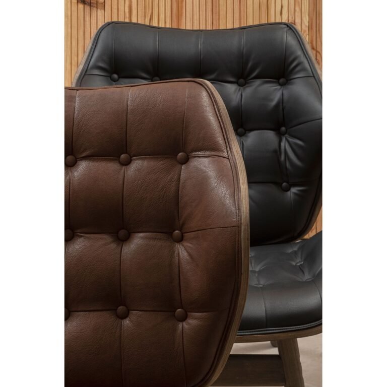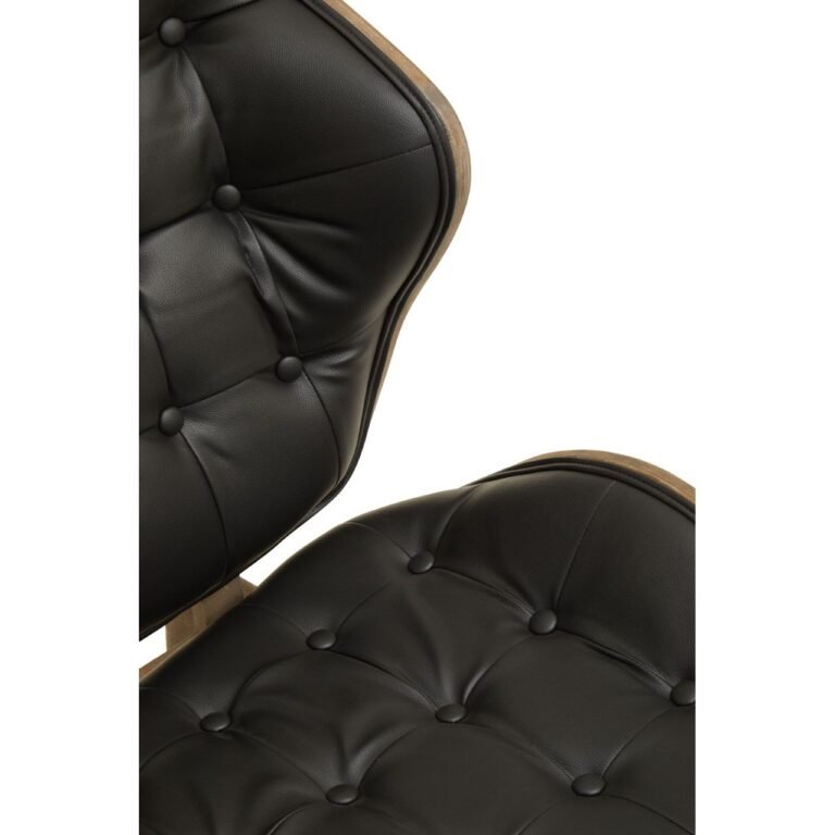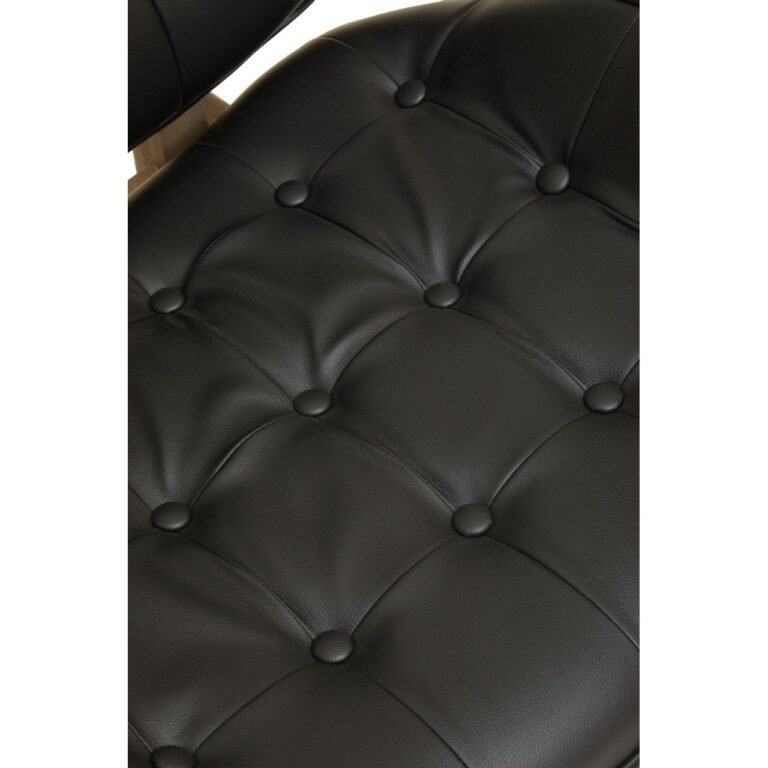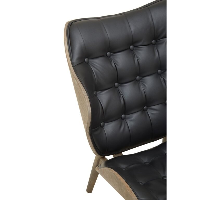 This Arche Black Leather Chair With Button Detail has a black faux leather backrest and seat, wrapped in an elm wood frame with coordinating splayed legs. The design-focused features create a mid-century modern aesthetic suitable for any contemporary home.