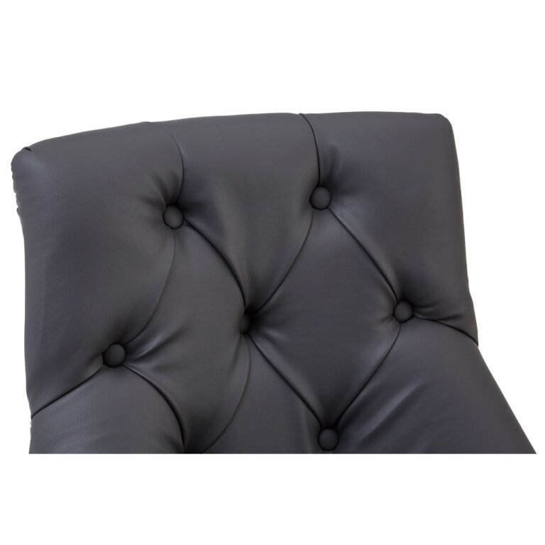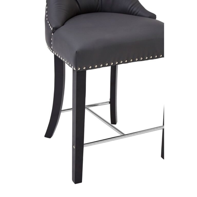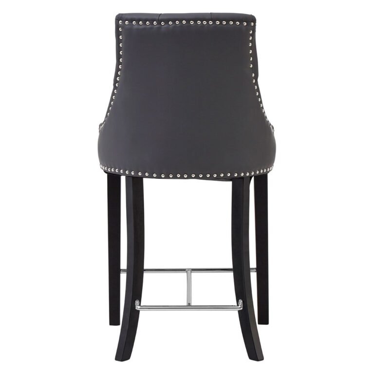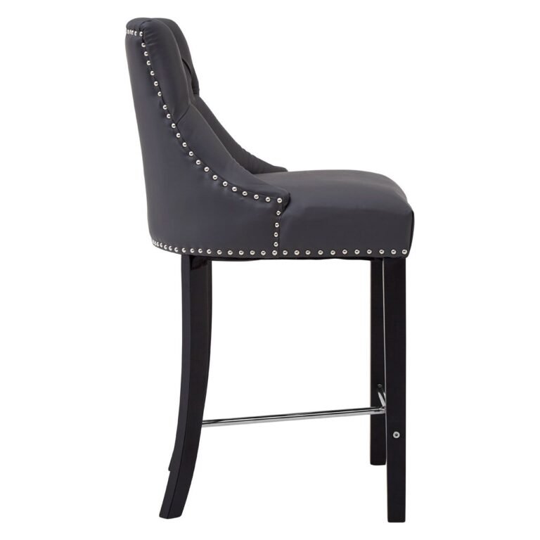 Argen Park Grey Faux Leather Bar Chair: Upholstered in dark grey fabric, this dining chair’s cushioned seat and tufted backrest invites the sitter to linger for as long as possible. Reflective studs punctuate the front and side rails, as well as the stile and crest of this chair. A decorative metal bullring adds a quirky touch to its back. Eco-friendly hevea wood legs provide support.