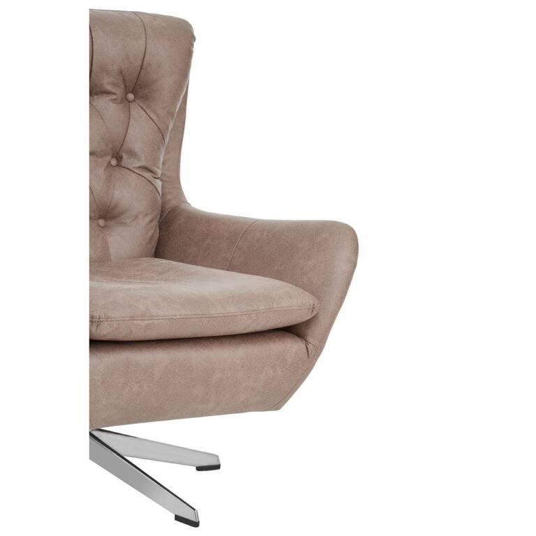 The Arnold armchair has a grand, sweeping design and is supported by a metallic silver swivel base. The large seat is dressed in soft, light brown faux leather. The button tufting on its high back gives it a textured look.