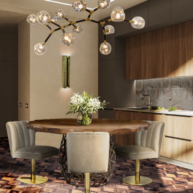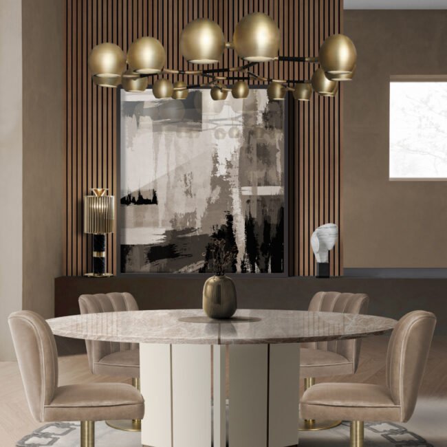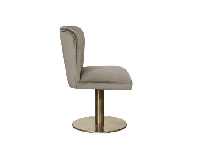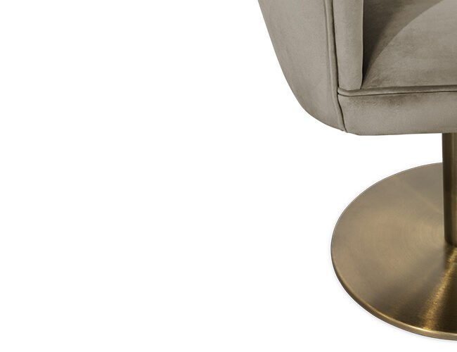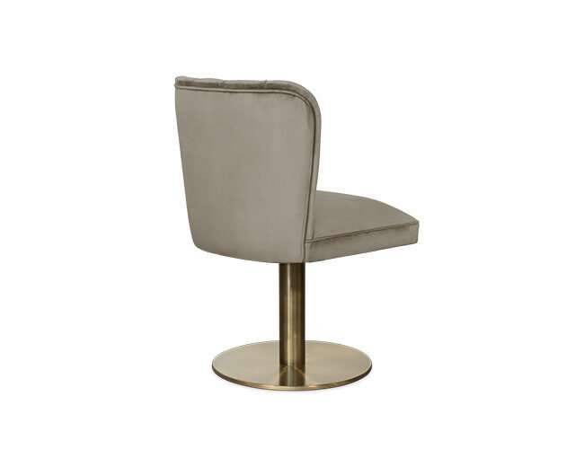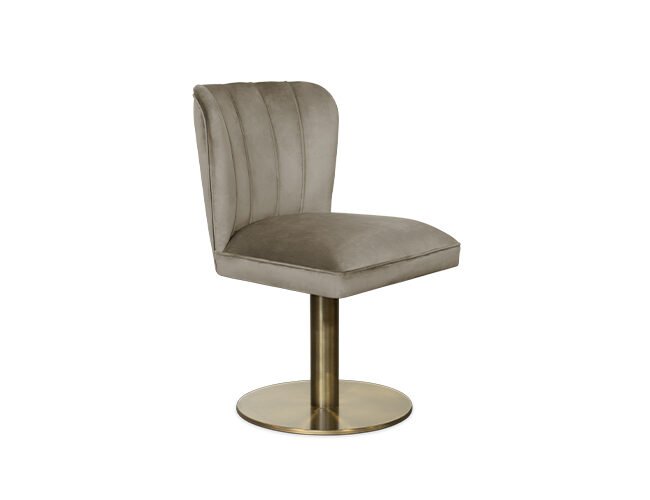 The DALYAN Swivel Dining Chair was inspired by Cleopatra and her opulent and elegant furniture. Upholstered in synthetic leather and with a swivel base in brushed aged brass matte, the DALYAN Swivel Grey Dining Chair balances feminine shapes with neutral tones, being ideal for any type of design.