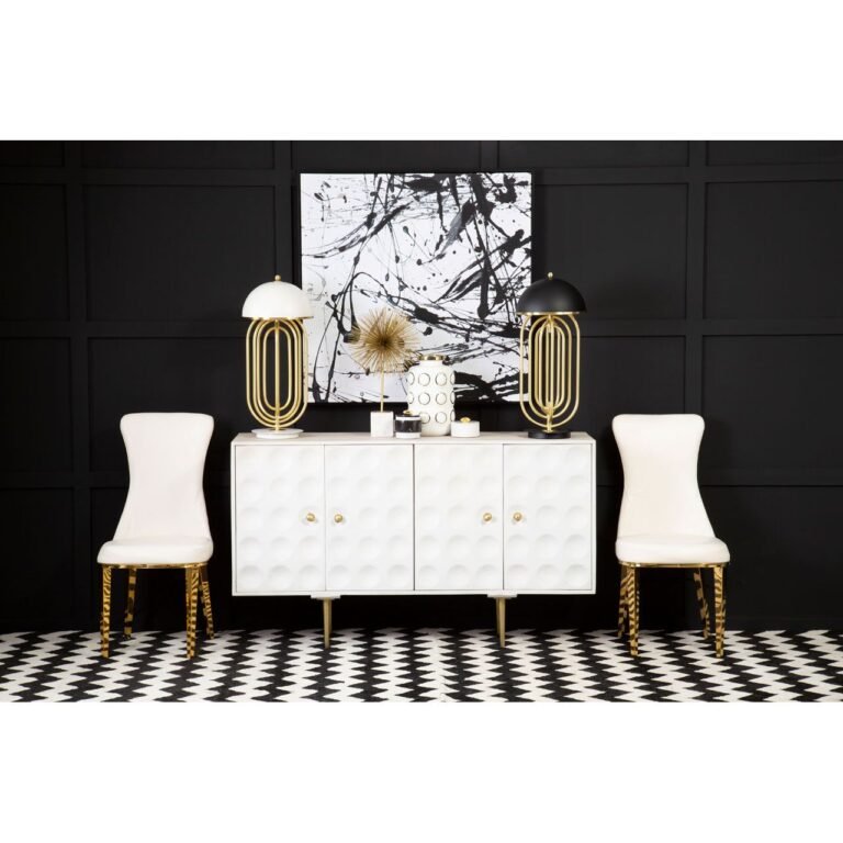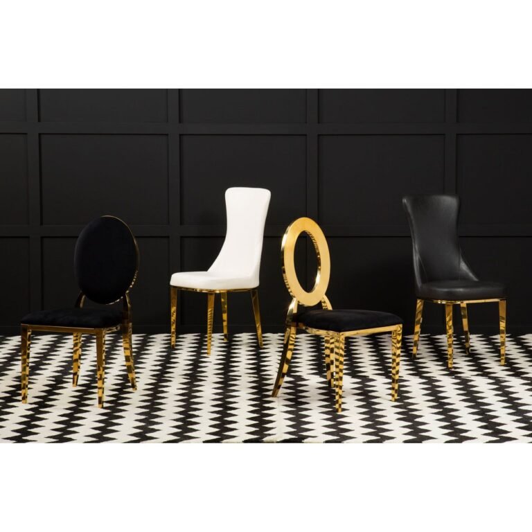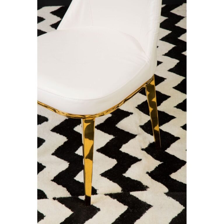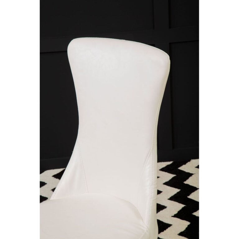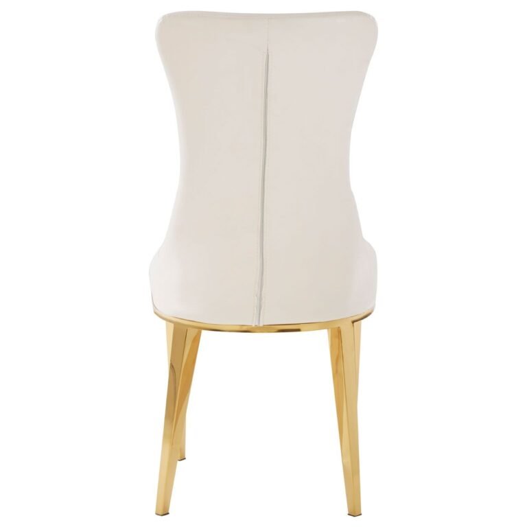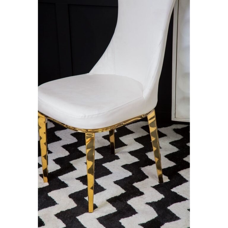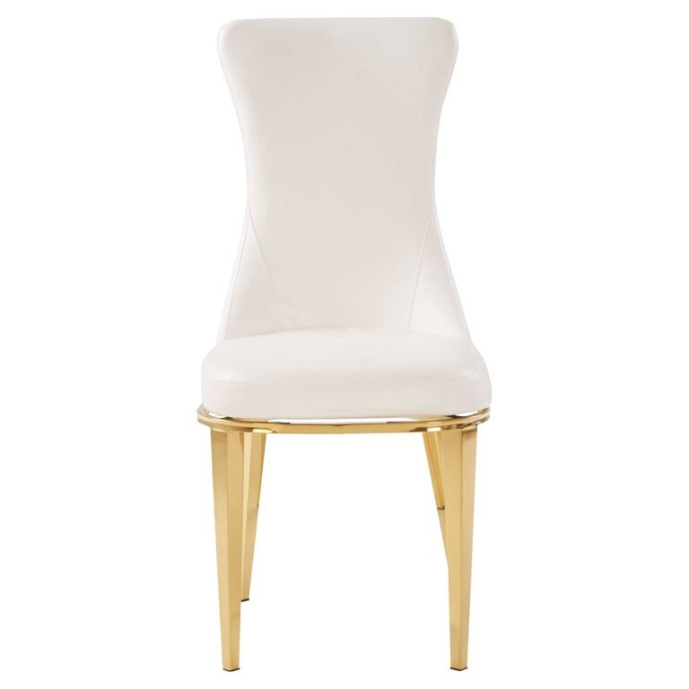 Crafted from faux white leather, this Flori White Dining Chair has padded seat and curved backrest in a smooth texture. Its gold finish stainless steel legs feature clean lines in the luxe accent which seamlessly blend with the soft upholstery.