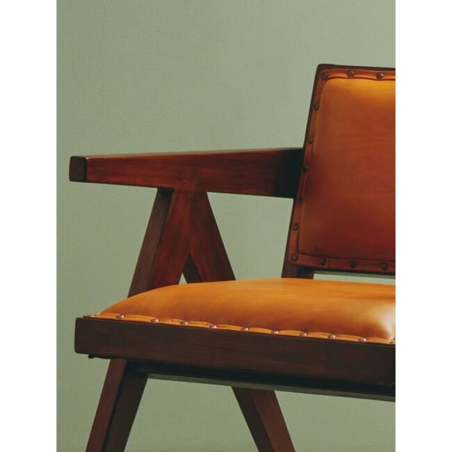 This large armchair has a comfortable padded seat and slanted back, upholstered in tan genuine leather with metallic studs trim. The soft leather is matched with a solid teak wood frame which creates a modern aesthetic.