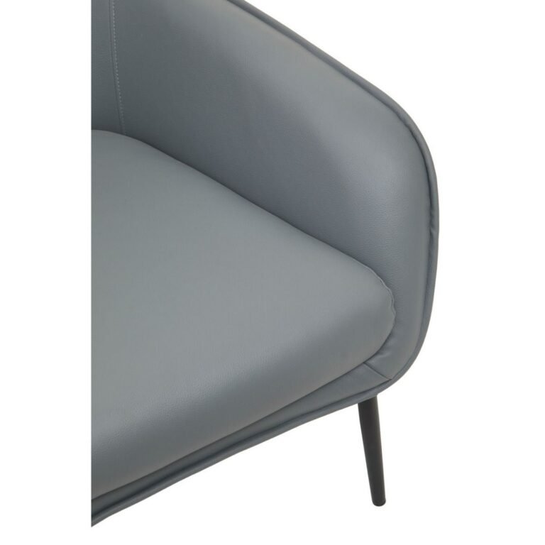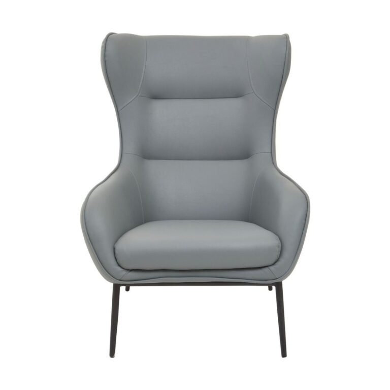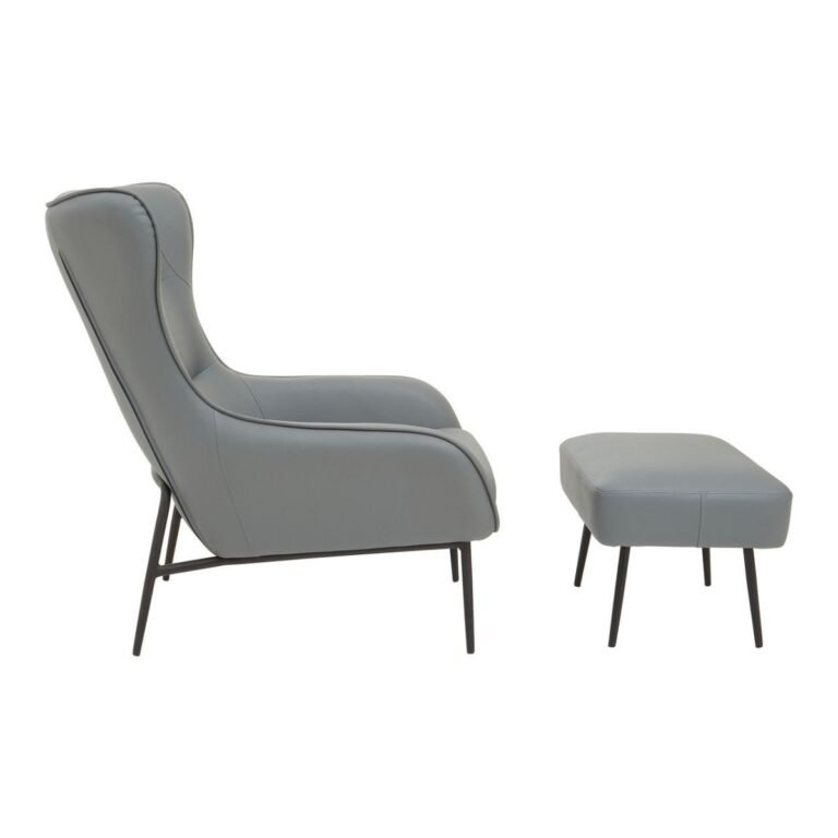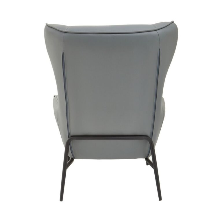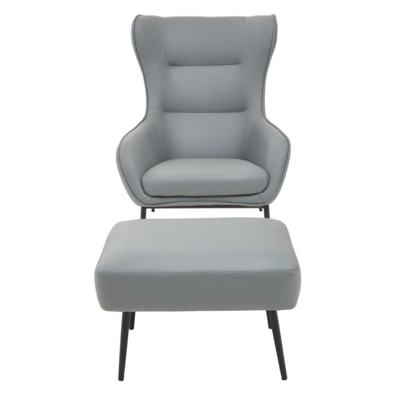 Kaliko Grey Armchair And Footstool: This mid-century inspired Kaliko wingback armchair is upholstered in grey faux-leather with metal legs in black finish. Completed with a matching footstool, this chair offers the perfect match with its timeless and minimal appeal in the living space.