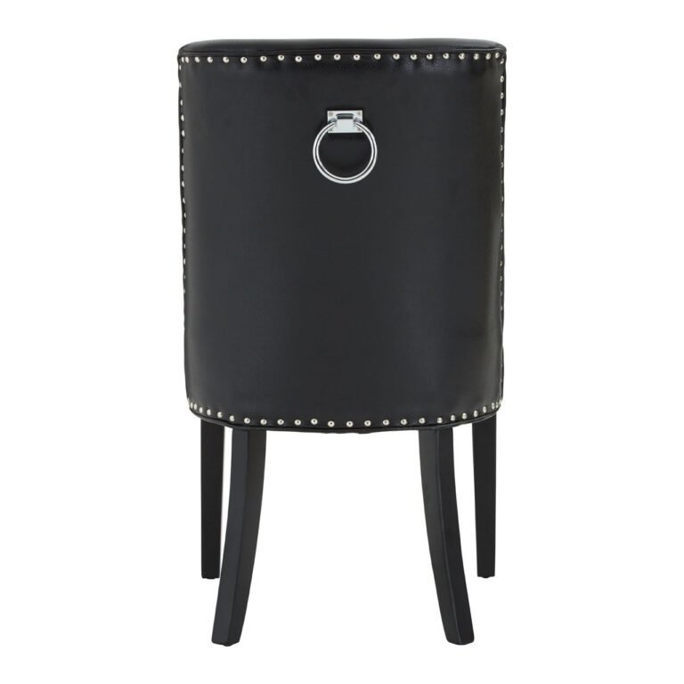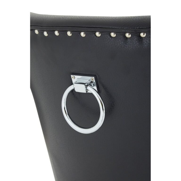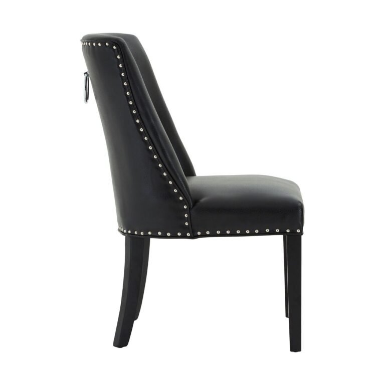 The Odeo Black Leather Effect Dining Chair’s gently reclined back and cushioned seat make it a comfortable for dining, while the black faux leather upholstery gives it a luxurious feel. Sturdy birchwood legs stand straight at the front, and curve gently in the back. A decorative metallic bullring on the chair’s back adds a quirky touch, complementing the stud detail that punctuates the chair’s fringes.