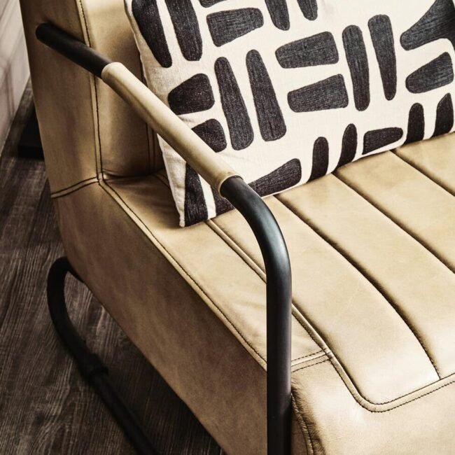 The Olk Buffalo Grey Leather Armchair has a sleek black iron frame and an ergonomically designed backrest.
