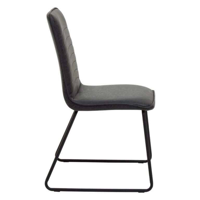 Olv Foundry Black Leather Effect Chair: Featuring vertical channel tufting, the Olv Foundry dining chair is crafted skilfully with black leather effect upholstery. Exhibiting a sleek and sturdy profile, this foam-filled chair is supported by a metal sledge base in a black finish.