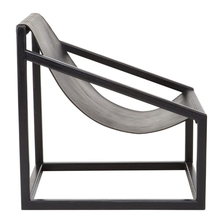 Stirling Black Cubic Frame Chair: The distinctive frame is crafted from natural, renewable teak wood and has a black finish that accentuates its unfussy design. A sling of soft leather forms the seat and is coloured black to seamlessly complement the wood. Part of the Stirling collection, coordinate it with minimal furniture and accent pieces.