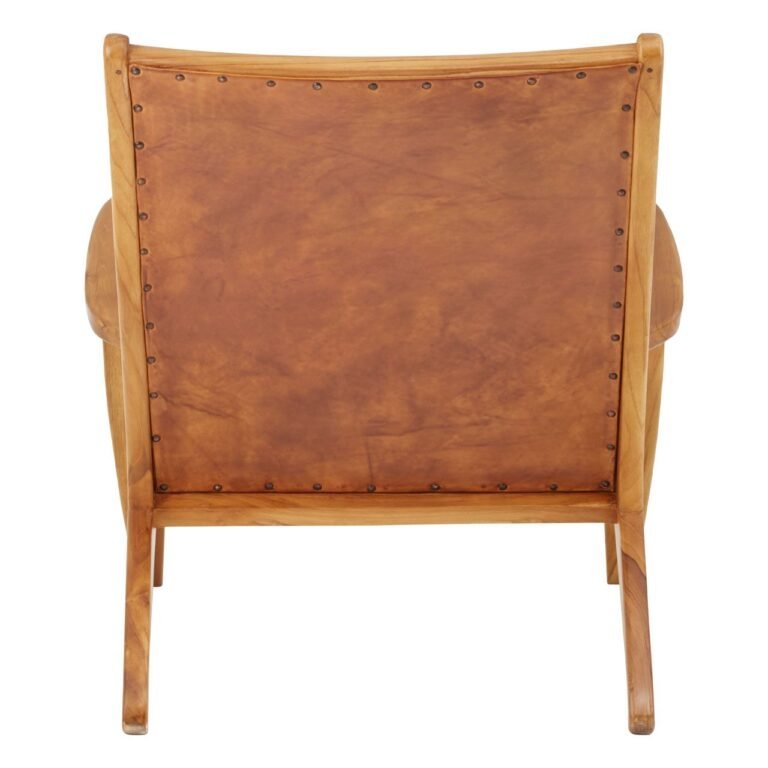 Stirling Brown Leather Chair: Its frame is crafted from sustainable teak wood and has a natural finish that amplifies its grain pattern. The style is laid back, with a tall angled backrest and long armrests that are designed to maximise comfort. Both seat and backrest are upholstered with soft leather. Stud detail introduces a metallic touch to the aesthetic.