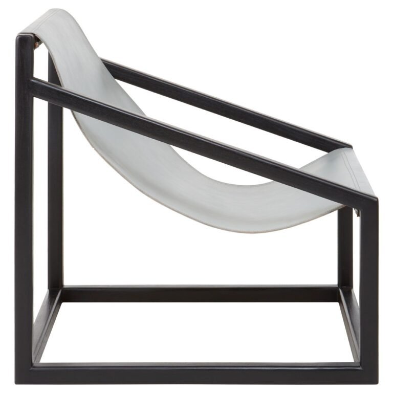 Stirling Grey Cubic Frame Chair: The distinctive frame is crafted from natural, renewable teak wood and has a black finish that accentuates its unfussy design. A sling of soft leather forms the seat and is coloured grey to create a contrast with the wood. Part of the Stirling collection, coordinate it with minimal furniture and accent pieces.