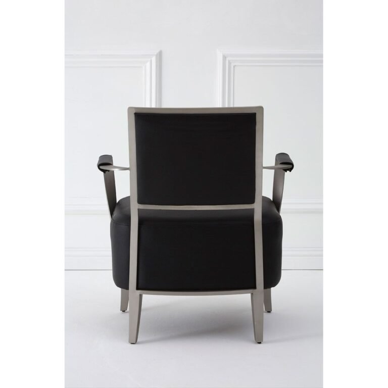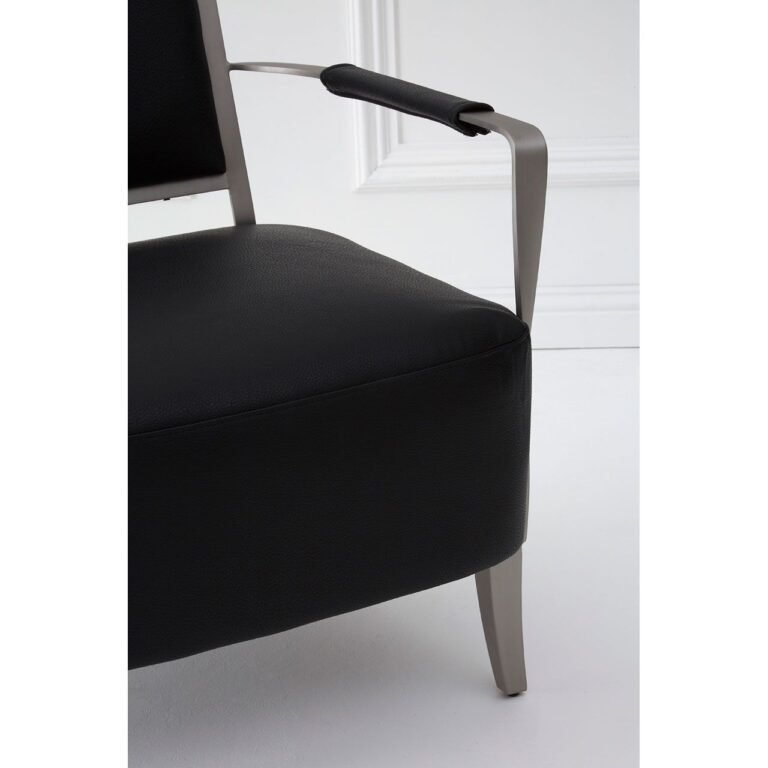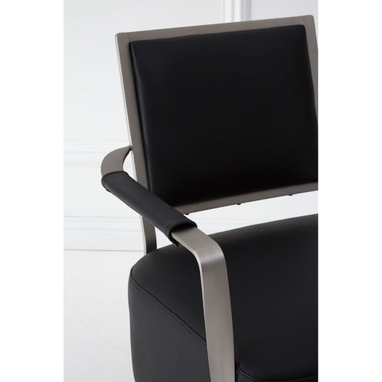 Todar Black Leather Chair: Textured black leather is used to upholster the chair’s expansive seating area, with coordinating leather finishes on its back and arms. The frame is made from tough stainless steel, with a brushed finish that gives the metal a muted satin look. Its arms travel outwards, before reducing into the front legs with a gentle twisting motion. Contrasting straight lines are used at the rear for the backrest.