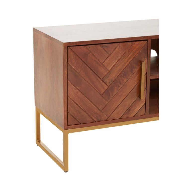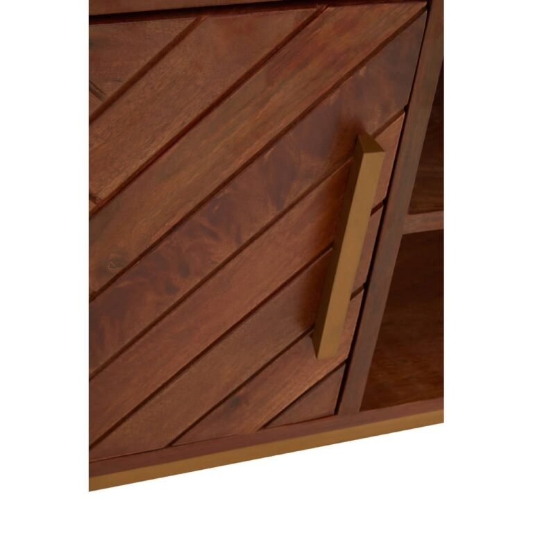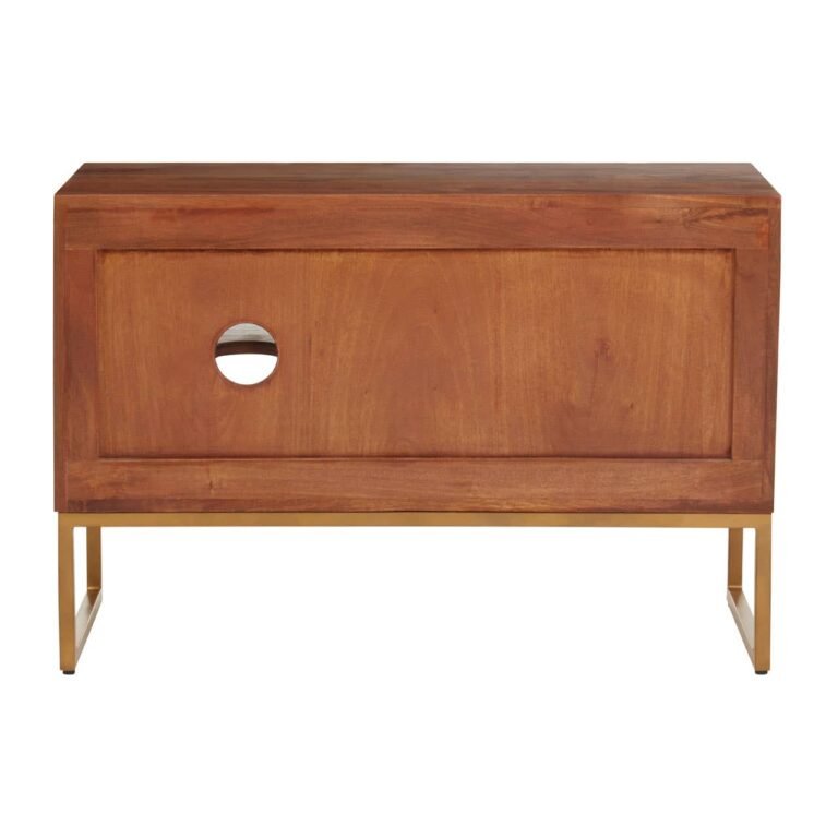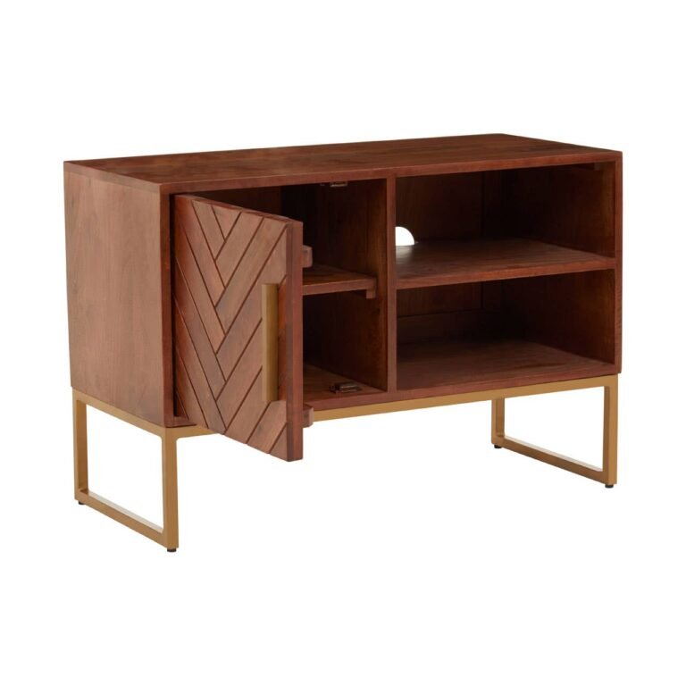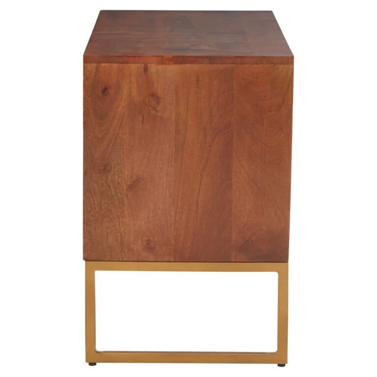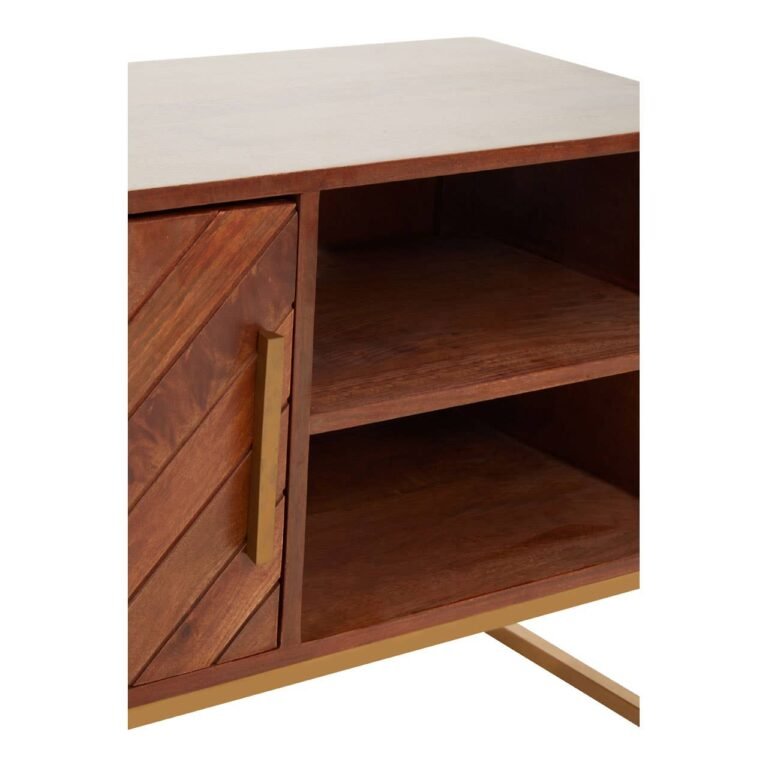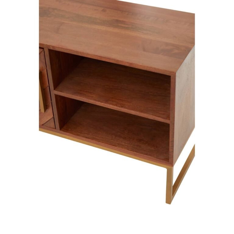 The Ayar small media unit has an elevated bohemian aesthetic created by the paneled mango wood and gold iron details. In addition to style, the media offers an abundance of storage within the open shelves to the right and enclosed shelving on the left.