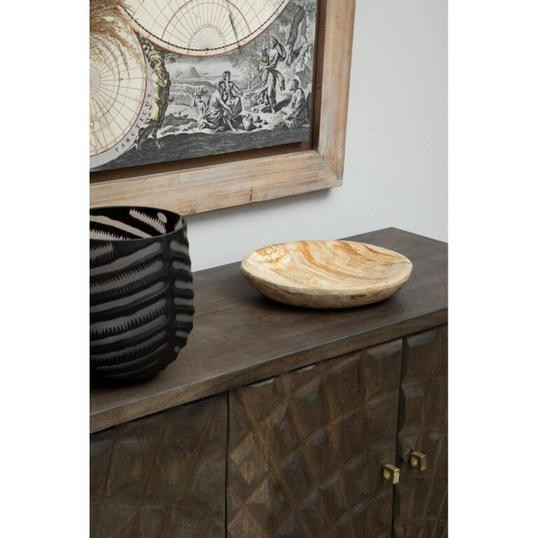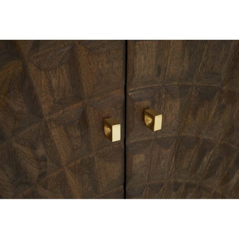 Finished in solid mango wood paired with sturdy gold legs, this grey finished sideboard features embossed faceted patterns in an array of natural splits and graining. The appealing grey and gold finished rhombus patterns highlight the additional geometric style of this sideboard. Ample storage placed on sturdy gold legs offers functionality and versatility. Indeed a wise choice to display accessories and storing items. Geomteric