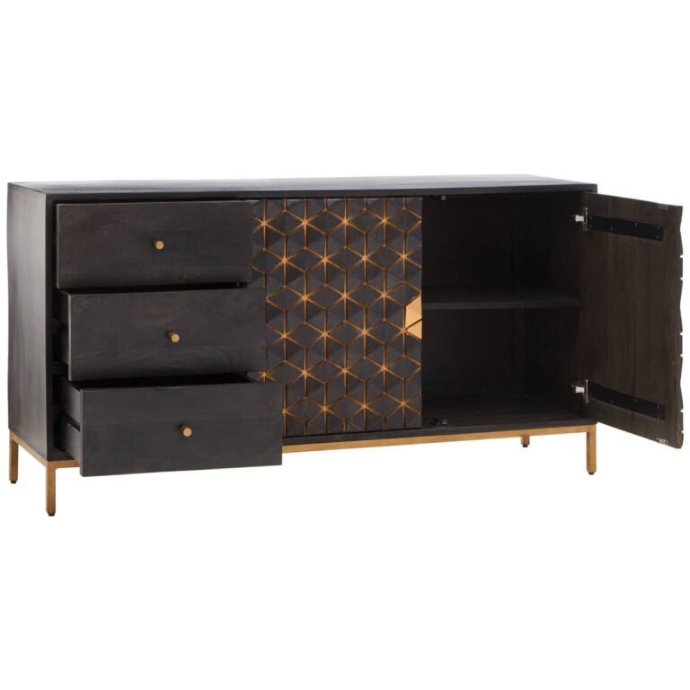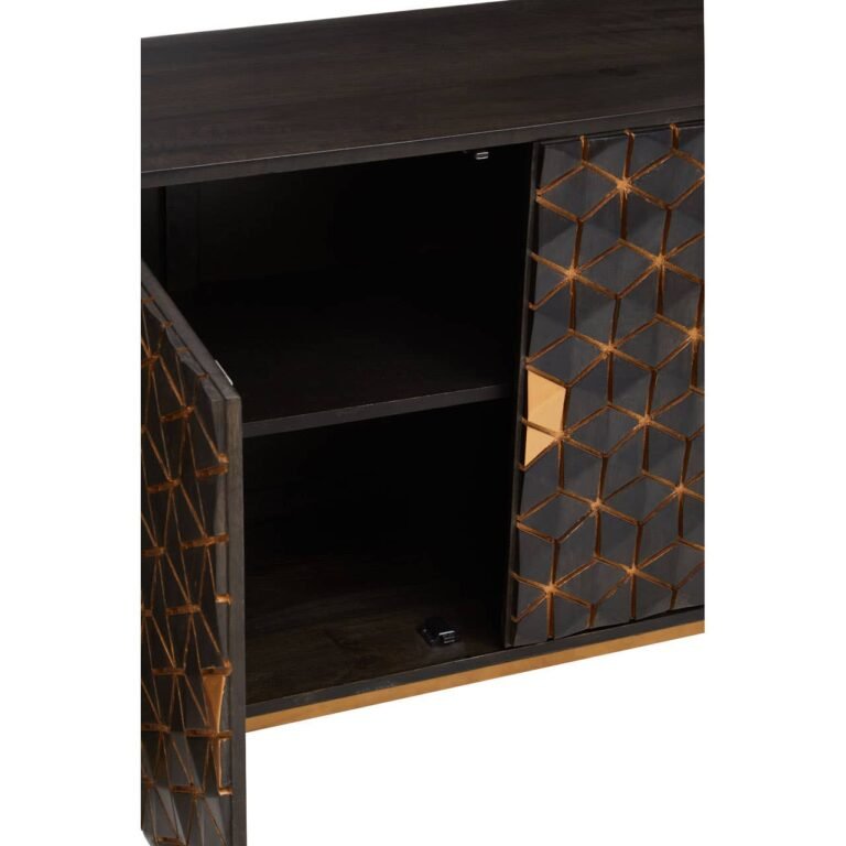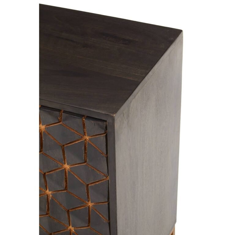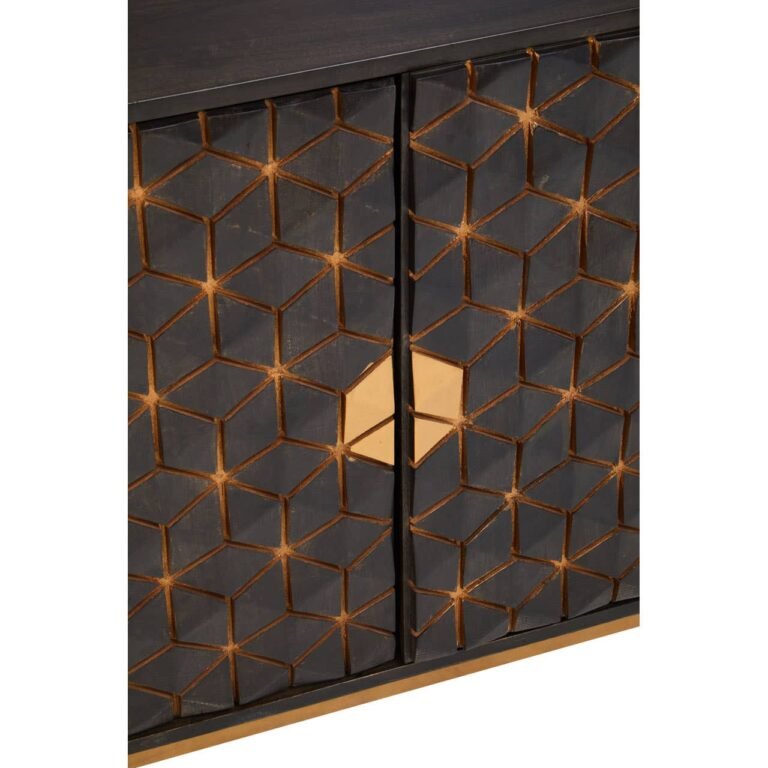 The Lobst Grey Sideboard table is contemporary and sleek, grey mango wood is adorned by hexagonal gold iron detailing across the doors, balanced by three minimalist drawers, creating storage solutions.