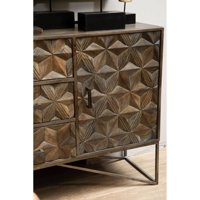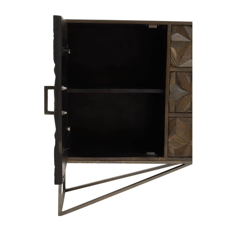 This sideboard features a geometric flowery pattern in grey finish with structure placed on a sturdy metal frame. It is produced with mango wood making it long lasting. Made from solid mango wood in grey shade, the sideboard’s transitional design is both modern and unique. It dons an elegant, geometric flowery pattern on the front which compliments linear and durable metal base with an expansive surface and a roomy storage.