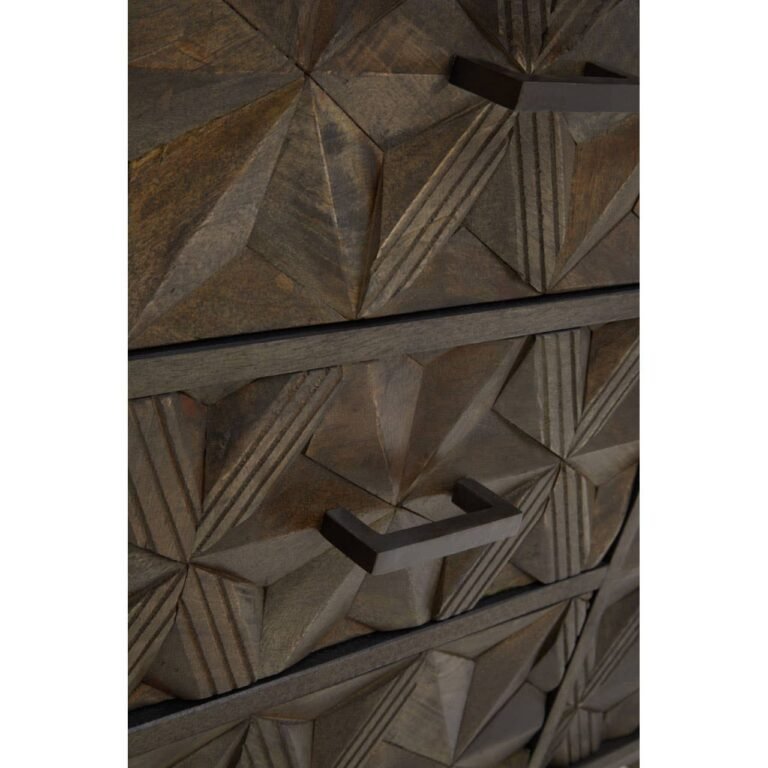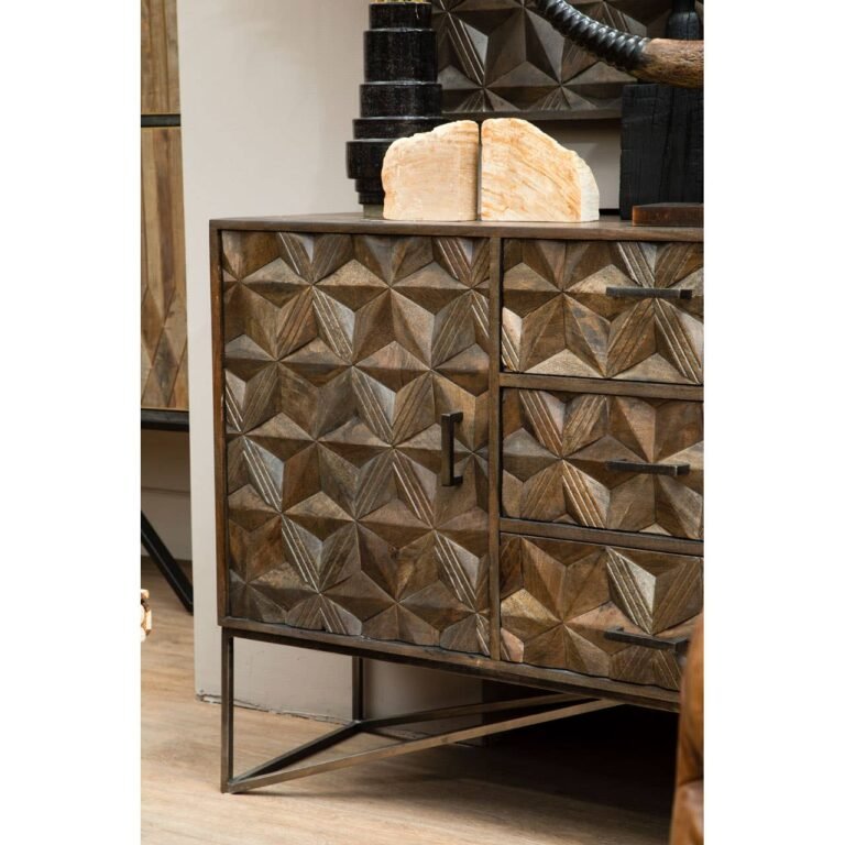 Olana Sideboard: Made from solid mango wood in grey shade, the sideboard’s transitional design is both modern and unique. It dons an elegant, geometric flowery pattern on the front which compliments linear and durable metal base with an expansive surface and a roomy storage.