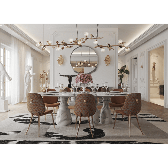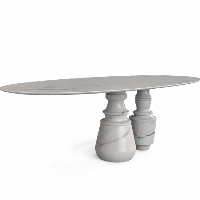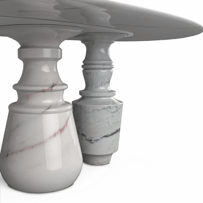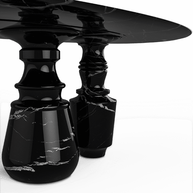 Reminding the renaissance era, its oval top gently lies in two robust marble columns, each one conceived from solid blocks hand-sculpted and turned to create different details for additional texture. A noble material carved in Boca do Lobo workshops, conceiving a soulful statement dining table ideal for elegant and refined dining rooms.