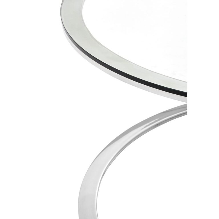 Its base is made from sleek stainless steel, and has a reflective finish. Two triangular forms create an inverted, asymmetric aesthetic, both of which are connected to wide circles at the top and bottom. Clear tempered glass is used for the tabletop. Display this angular piece with opulent boutique hotel furniture.