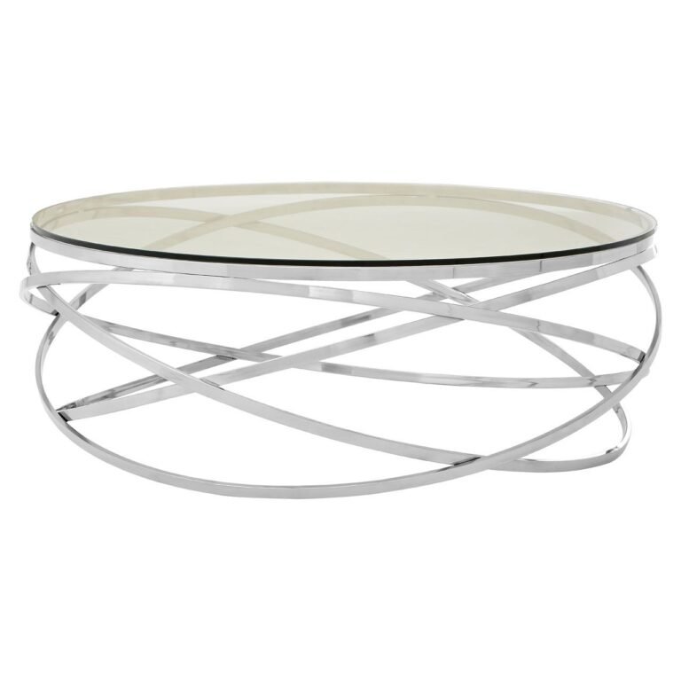 The Alia coffee table is a highly contemporary statement piece for the living room. Its base is made from four large stainless steel hoops interlinked to create a lattice. Their reflective finish complements silver-toned textiles and lighting. A matching stainless steel band sits atop the base to provide a platform for the clear tempered glass tabletop.