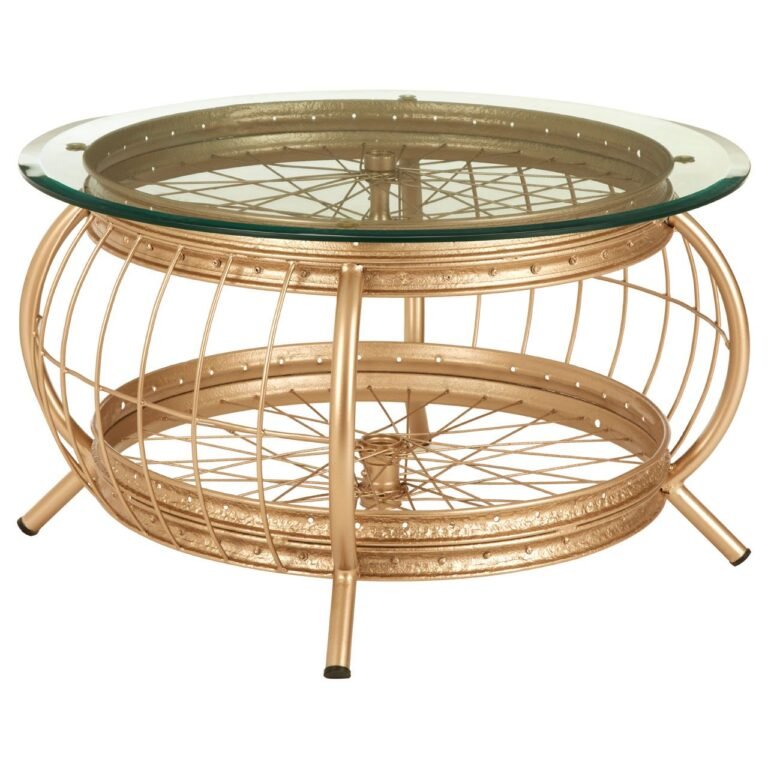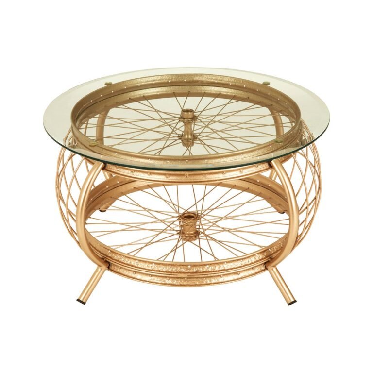 Elvetham Champagne Gold Finish Coffee Table: A round, clear glass top allows the table’s bicycle spoke style frame to be fully visible. The intricate iron frame boasts an elegant champagne gold finish.