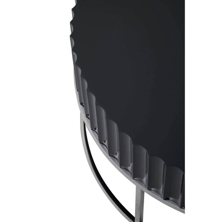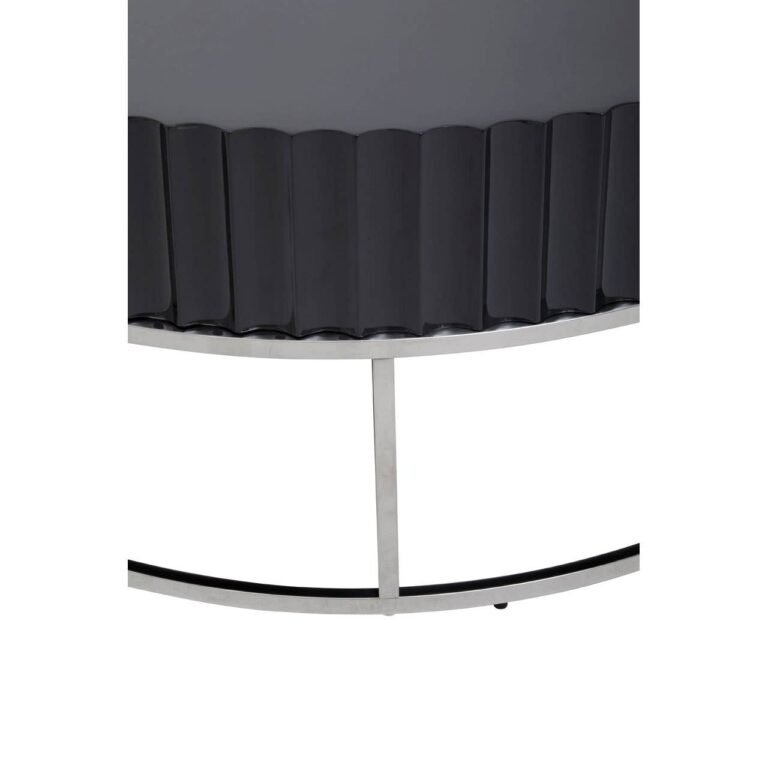 Lenoa Grey Finish Coffee Table: This round coffee table’s tabletop has a flat top with fluted carvings around it in a high gloss grey finish. The decorative top forms a monochrome contrast with the open and airy, polished stainless steel frame.