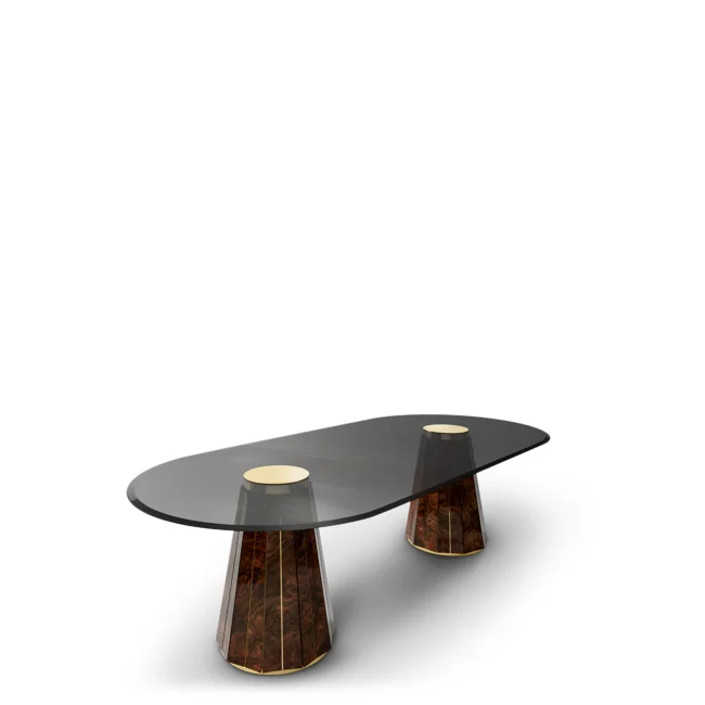 Darian Oval Dining Table: Darian returns with more volume and an oval shape. The robust bases with slight curvilinear accents are made of walnut root with metallic detailing, and the top is in smoked and tempered glass. The meticulously handcrafted design is an attentive solution to any luxurious atmosphere, creating a striking visual effect with its symmetrical character.