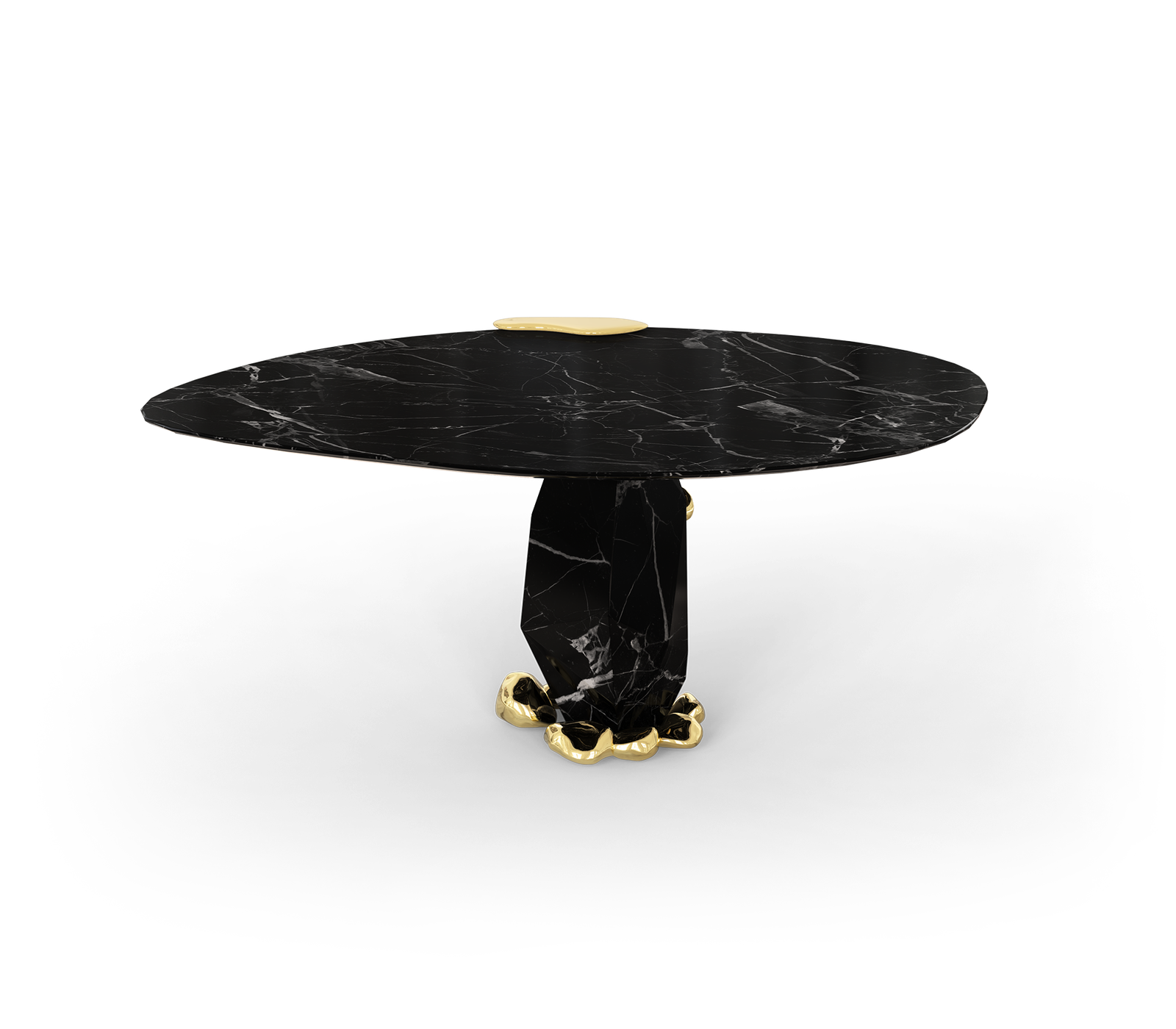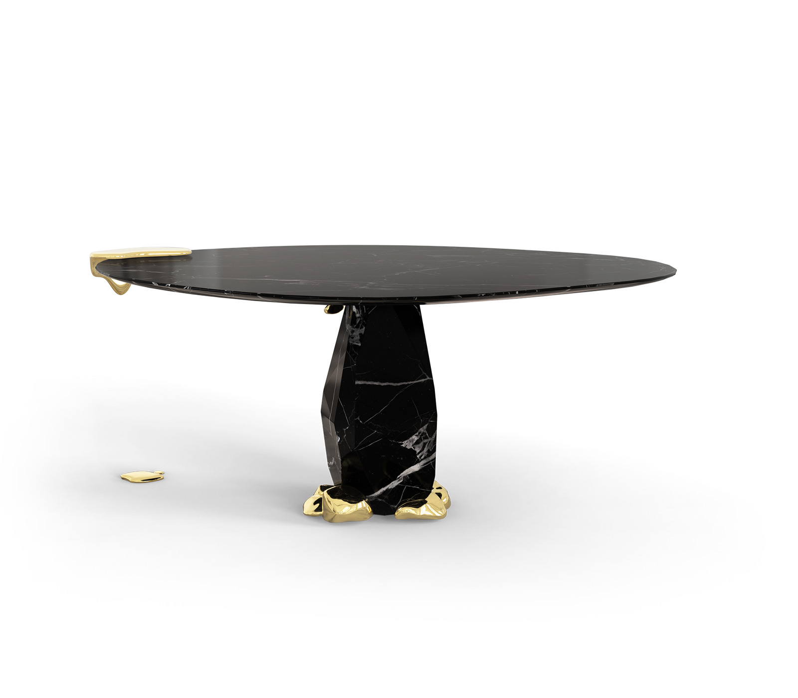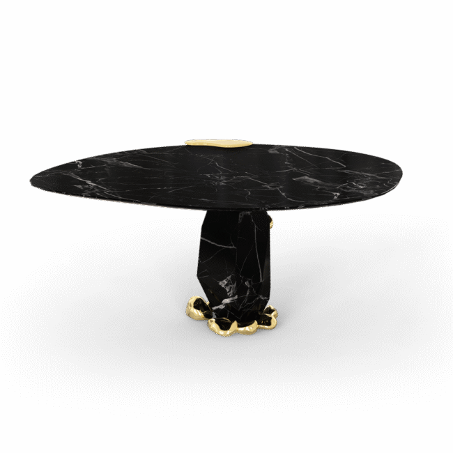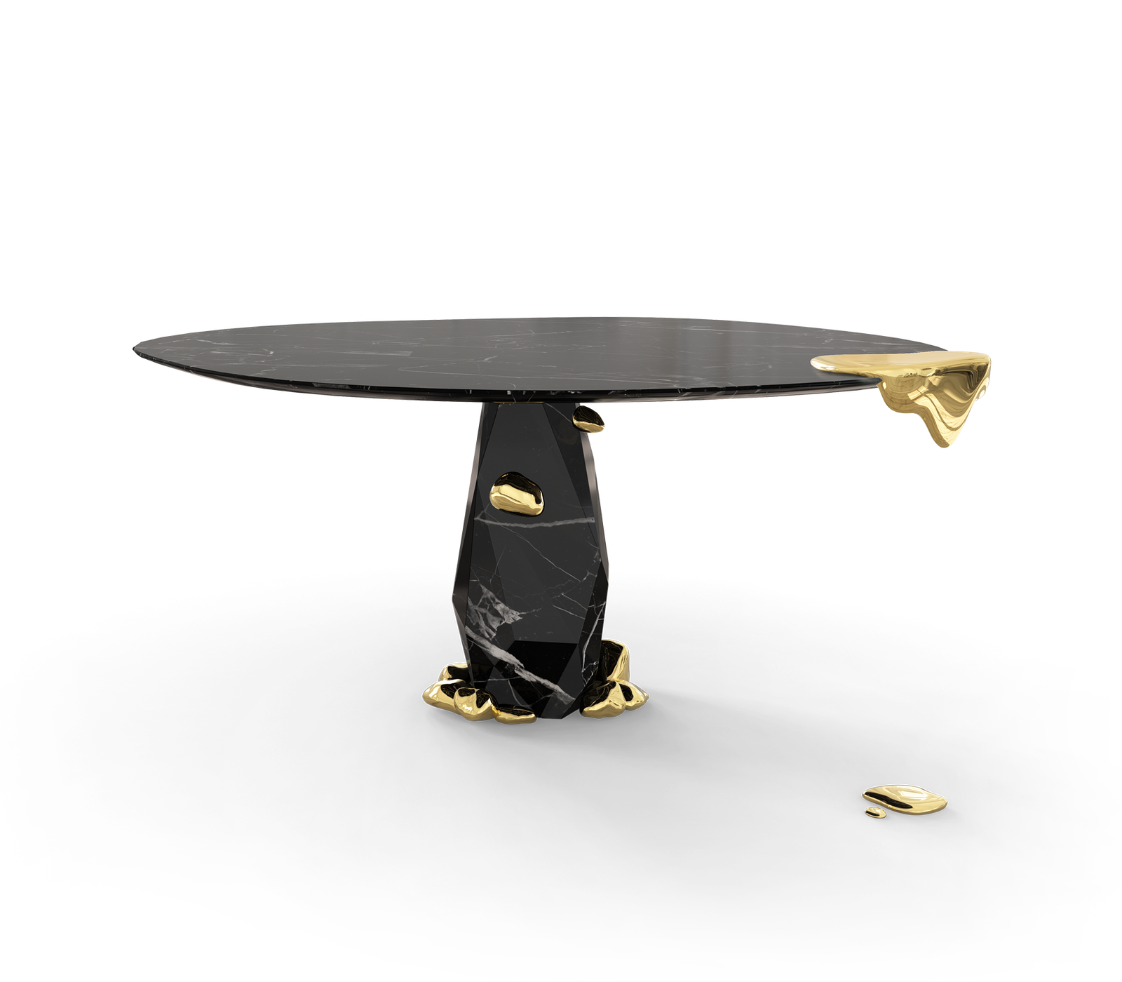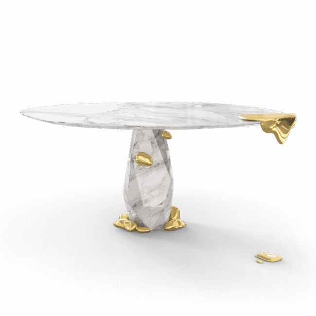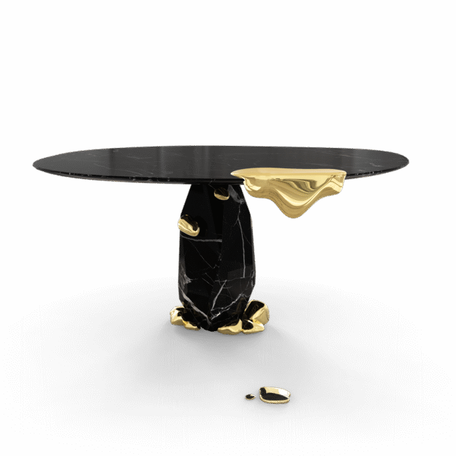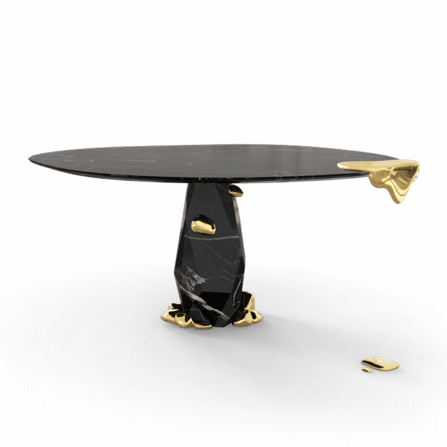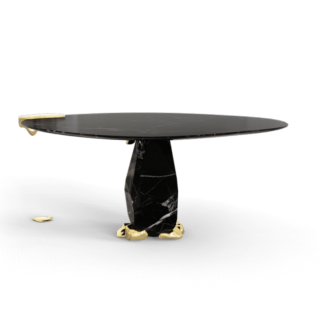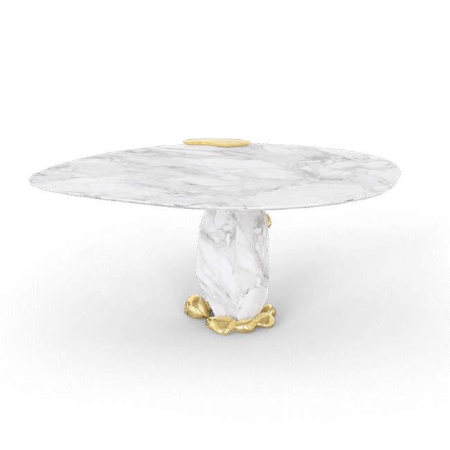 Diamond Dining Table: Taking interior design to a new level, this round dining table combines the refinement of marble with the artistic impact of gold details in organic shapes. Its round top rests gracefully on a base carved from Carrara marble, enriched by touches of molten gold that evoke a bold contrast between the robustness of the material and the artistic fluidity. Each piece is meticulously crafted by hand, reflecting Boca do Lobo’s commitment to exclusive design and attention to detail. Ideal as a focal point in sophisticated dining rooms or elegant living spaces, this table offers functionality for up to four people while transforming any environment into an experience of sculptural luxury. Combining classic and contemporary elements, this piece transcends the concept of furniture, becoming a true design icon for interiors that demand exclusivity and innovation.