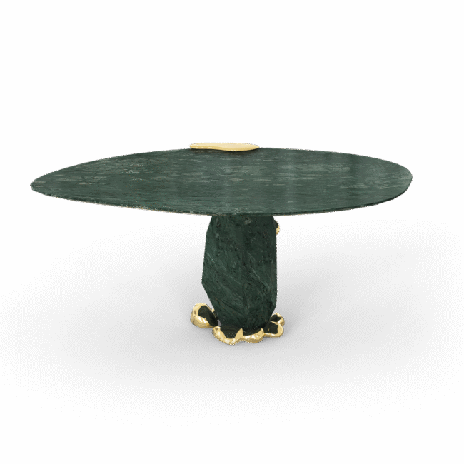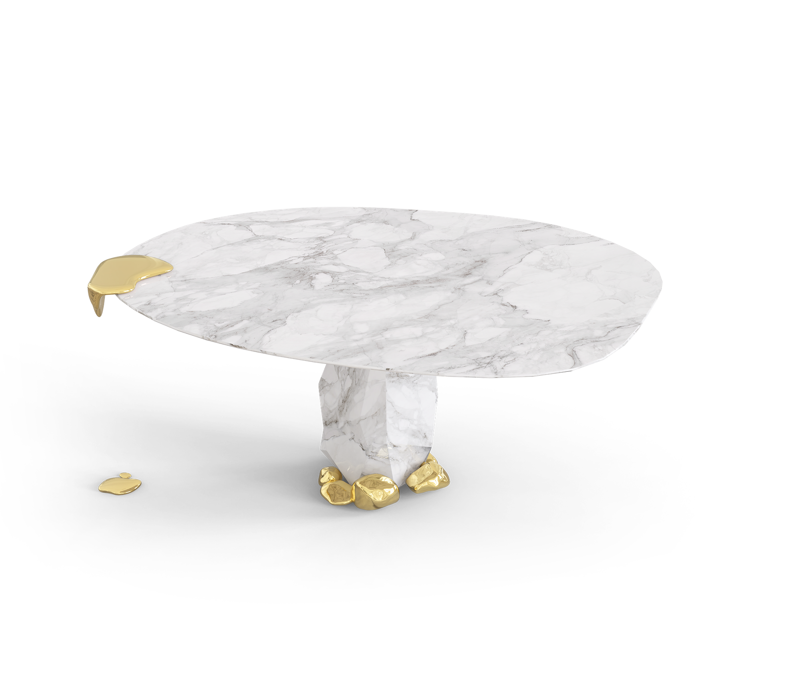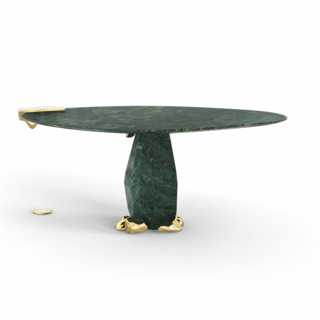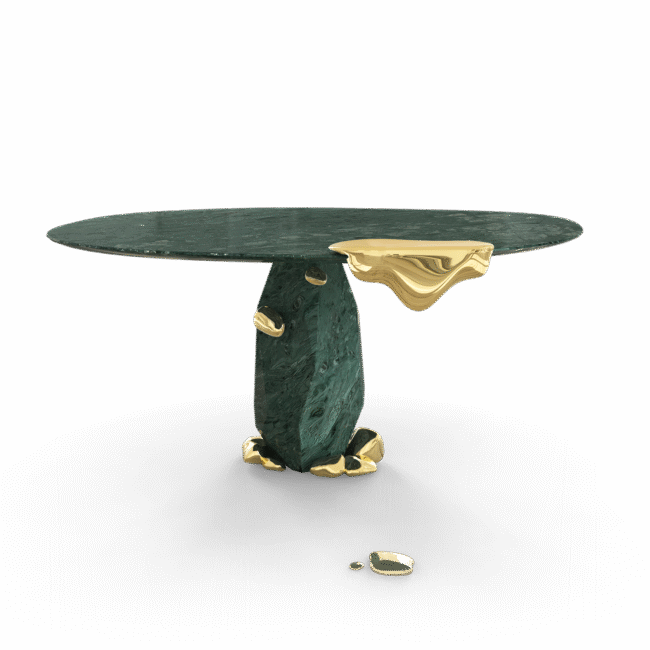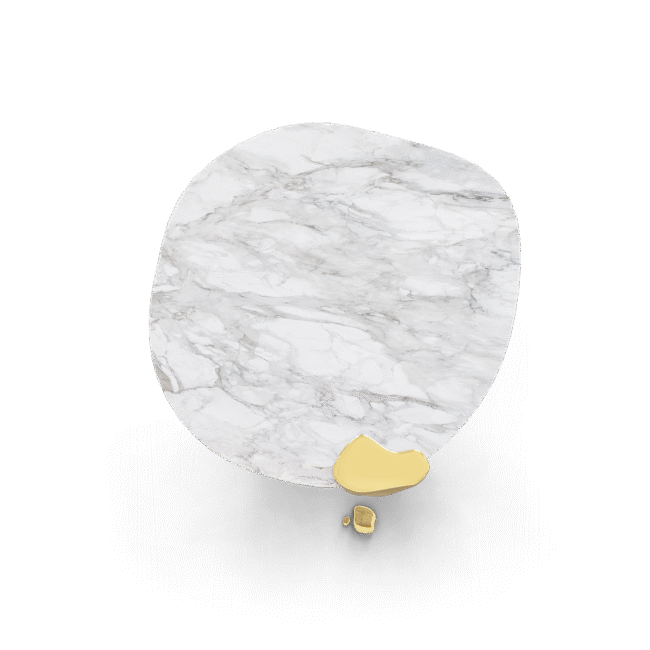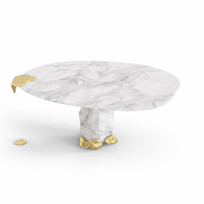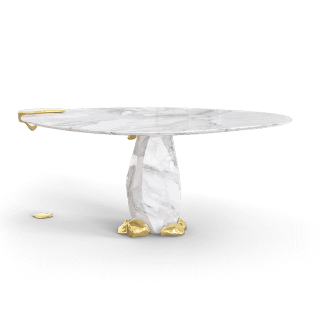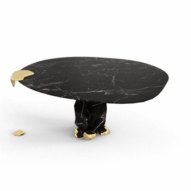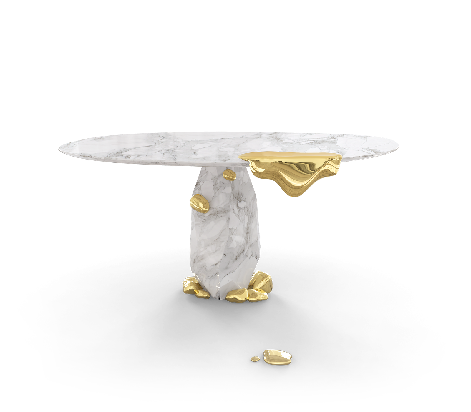 Diamond Dining Table: Taking interior design to a new level, this round dining table combines the refinement of marble with the artistic impact of gold details in organic shapes. Its round top rests gracefully on a base carved from Carrara marble, enriched by touches of molten gold that evoke a bold contrast between the robustness of the material and the artistic fluidity. Each piece is meticulously crafted by hand, reflecting Boca do Lobo’s commitment to exclusive design and attention to detail. Ideal as a focal point in sophisticated dining rooms or elegant living spaces, this table offers functionality for up to four people while transforming any environment into an experience of sculptural luxury. Combining classic and contemporary elements, this piece transcends the concept of furniture, becoming a true design icon for interiors that demand exclusivity and innovation.