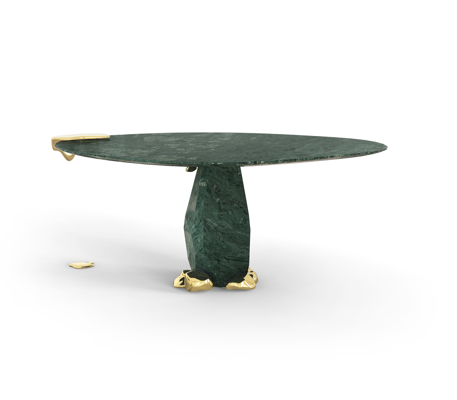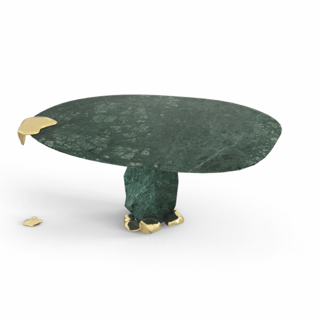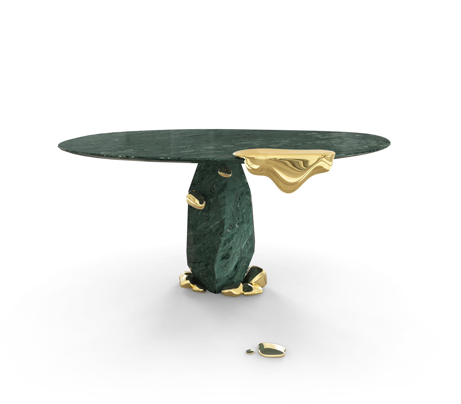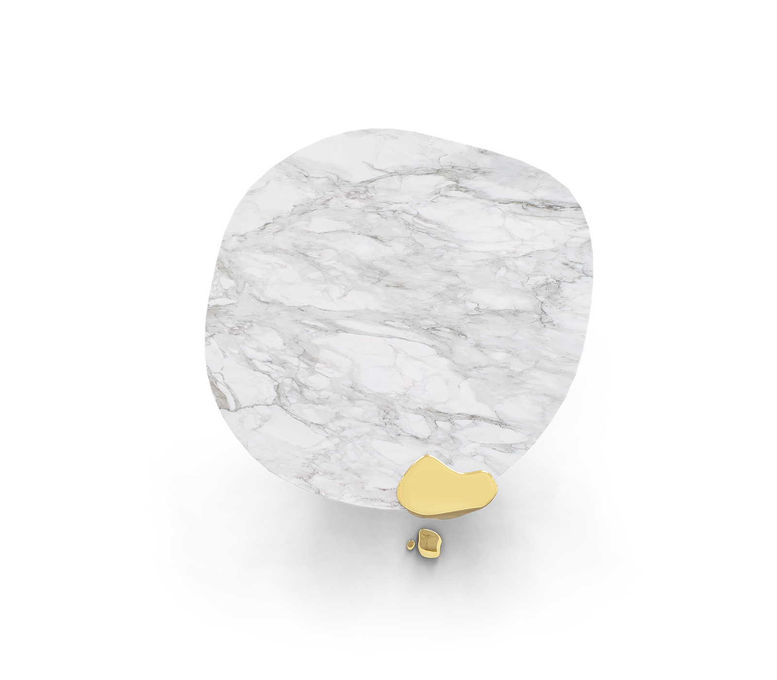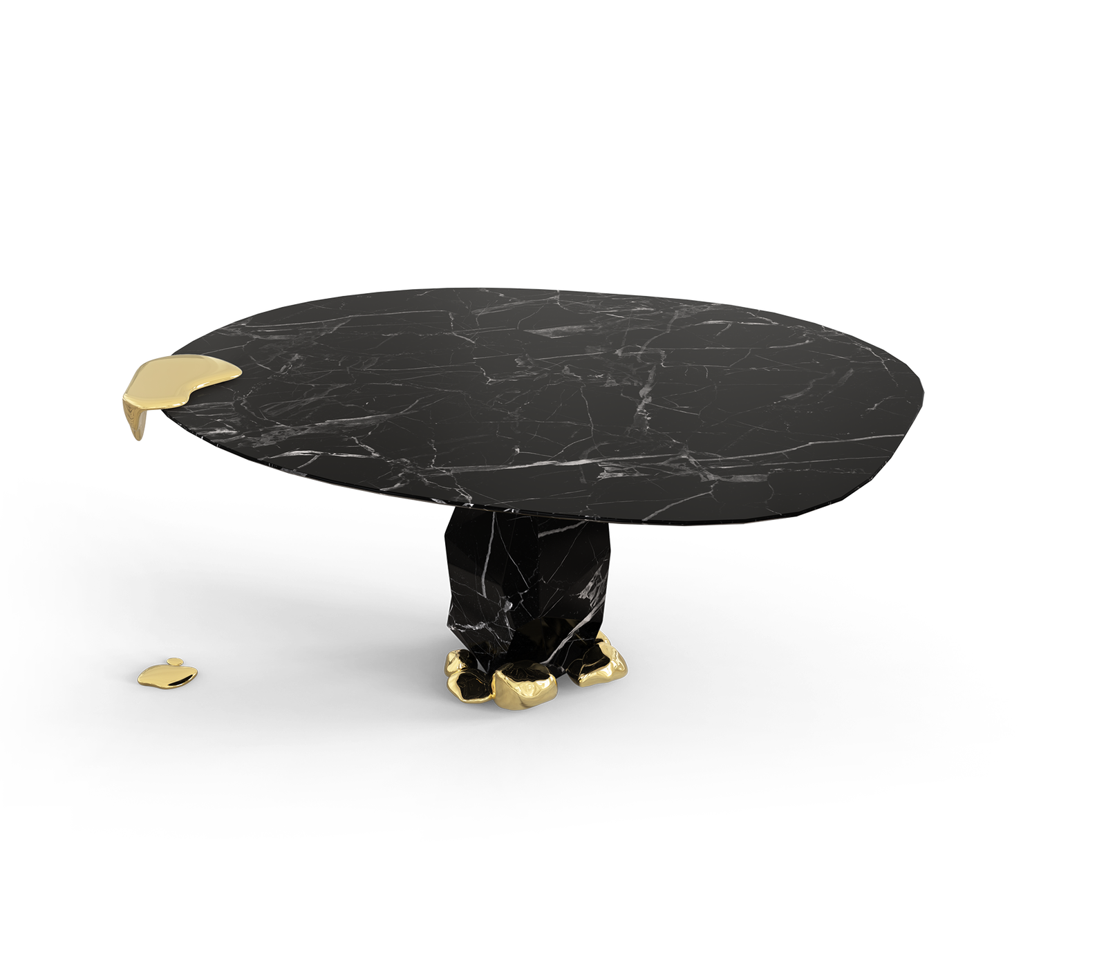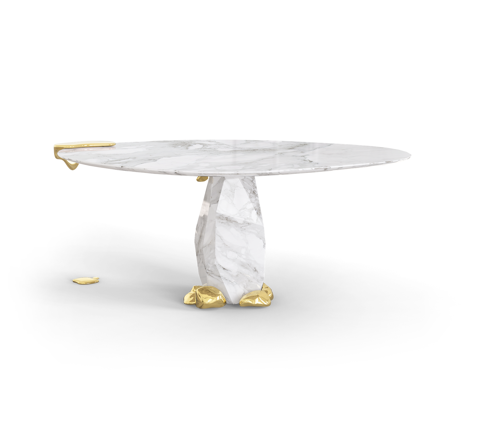 Diamond Dining Table: Taking interior design to a new level, this round dining table combines the refinement of marble with the artistic impact of gold details in organic shapes. Its round top rests gracefully on a base carved from Carrara marble, enriched by touches of molten gold that evoke a bold contrast between the robustness of the material and the artistic fluidity. Each piece is meticulously crafted by hand, reflecting Boca do Lobo’s commitment to exclusive design and attention to detail. Ideal as a focal point in sophisticated dining rooms or elegant living spaces, this table offers functionality for up to four people while transforming any environment into an experience of sculptural luxury. Combining classic and contemporary elements, this piece transcends the concept of furniture, becoming a true design icon for interiors that demand exclusivity and innovation.