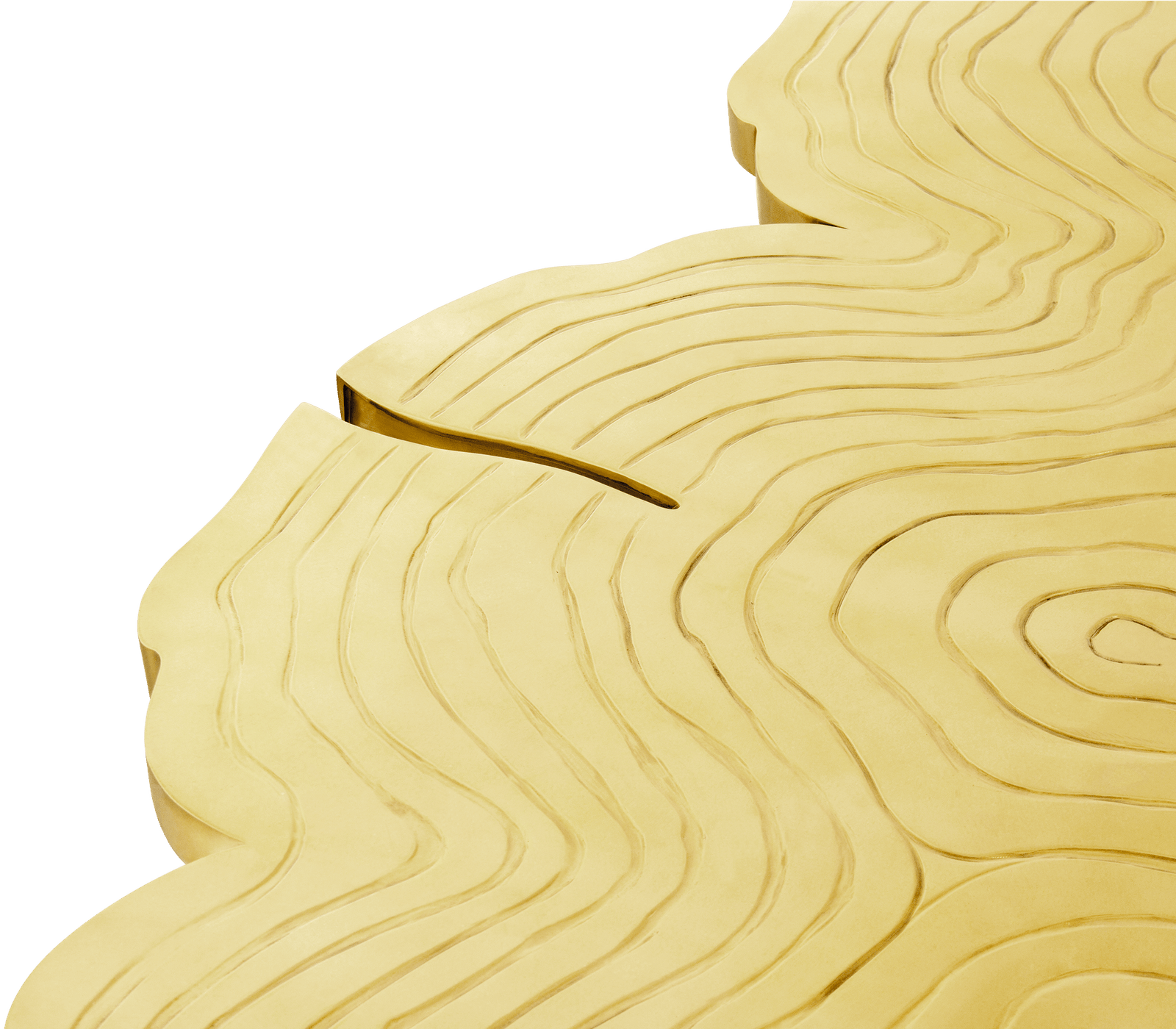 Made in wood and polished brass patina, this upscale dining table incorporates richest nature-inspired design, industrious welding techniques and a manually engraved top that emulates the outlines of log rings, reminding the timeline of a tree. Below the expansive 8 seat dining table top is an elegant composition of two scaled organic brass tubes.