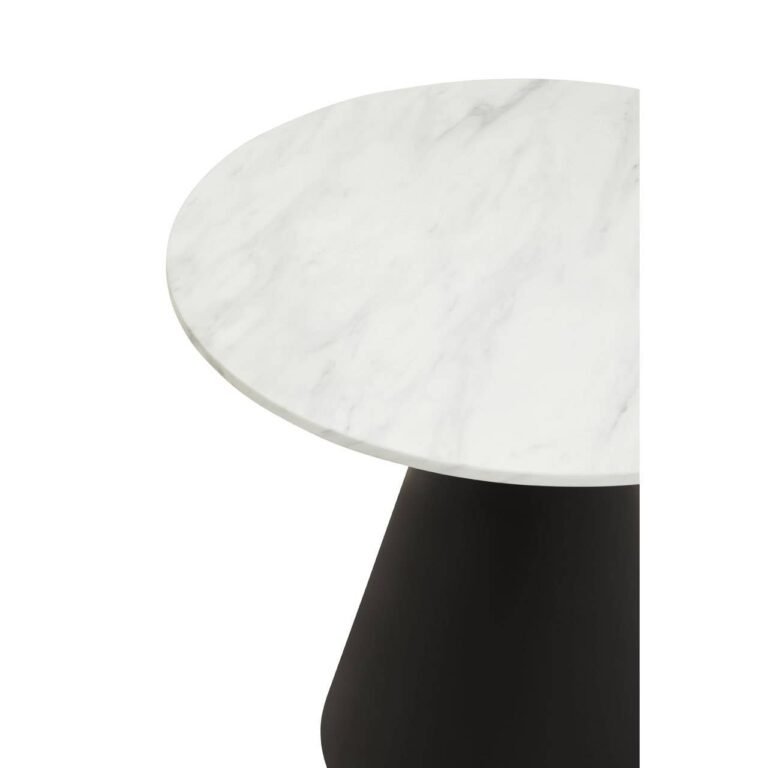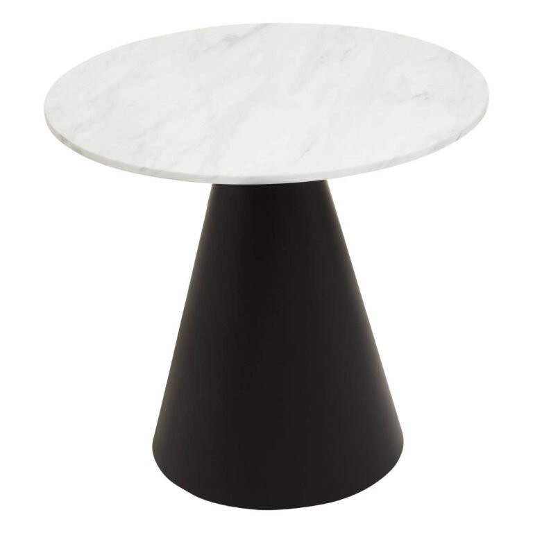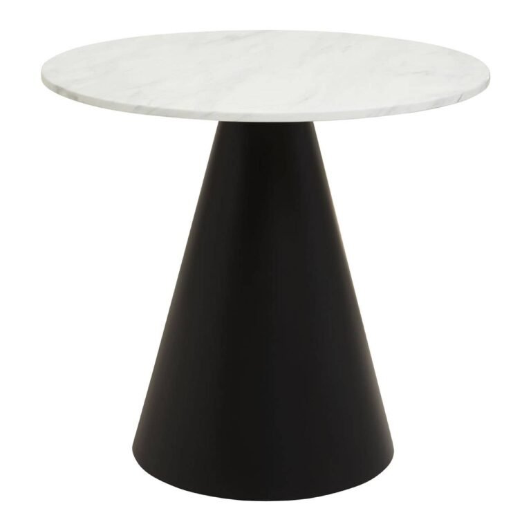 Hamil Round White Marble Top Dining Table: Featuring a clean and minimalist profile, this dining table has a smooth white marble top. The round tabletop sits atop an elegant conical base in black finish.