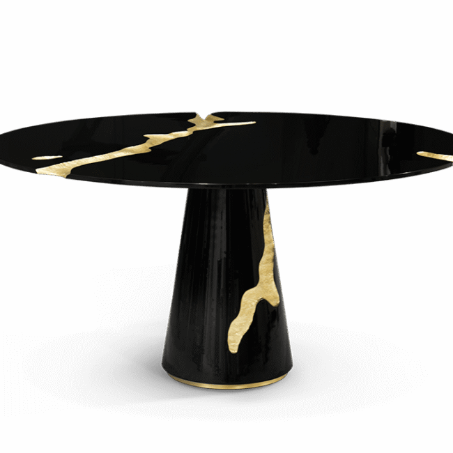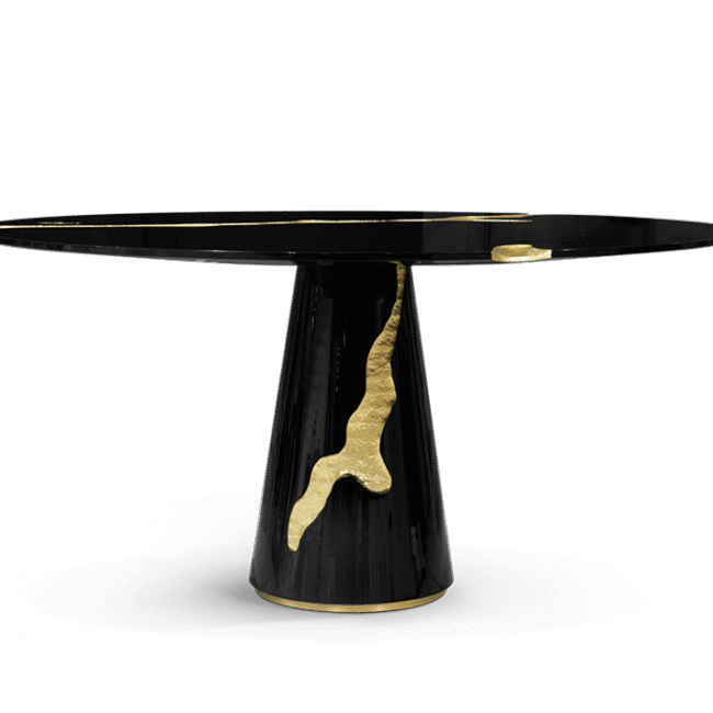 The Lapiaz dining tables surface is made in mahogany and white lacquer, with high polished brass details to fill the cracks. Its legs, also made from mahogany are finished the same way, and with polished brass sheets.