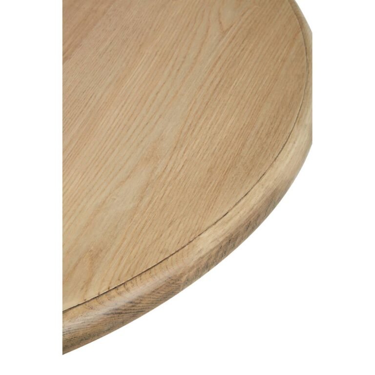 This round dining table is constructed from oak and finished in the natural shade with an angular and carved structure with inherent wooden grains.