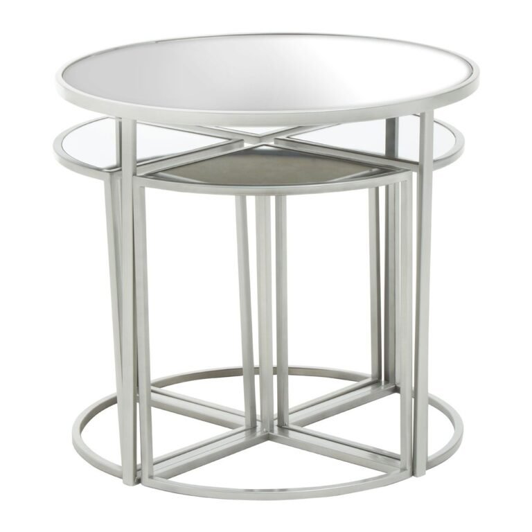 Tarume 5Pc Silver Finish Iron Tables: Ideal to maximise space, this set of five tables has a stackable design which brings style and function. Finished in metallic silver, four small triangular tables seamlessly glide under the round table to make an elegant focal point.