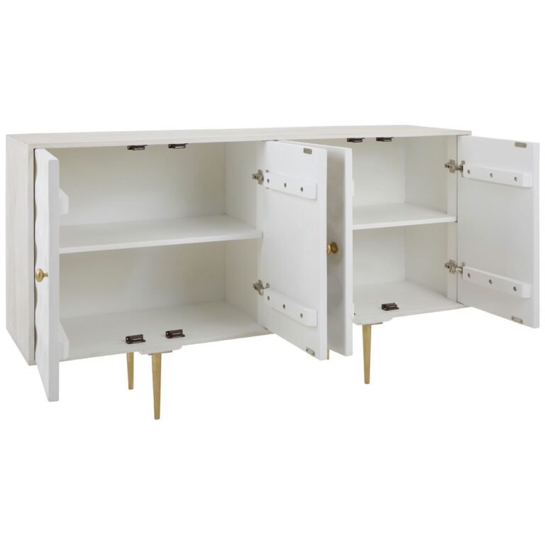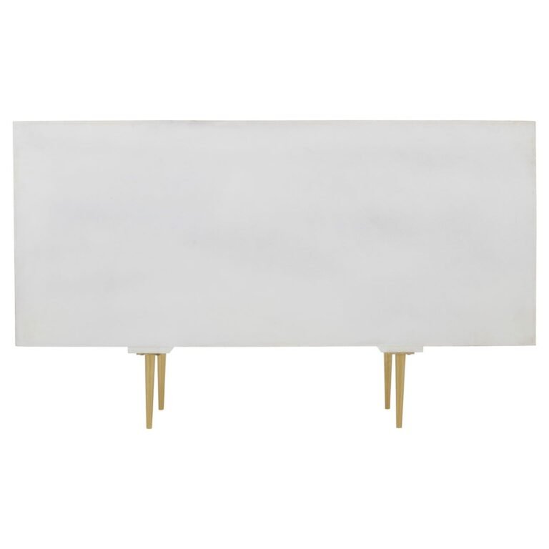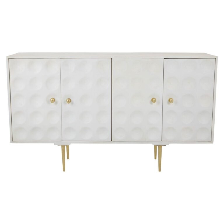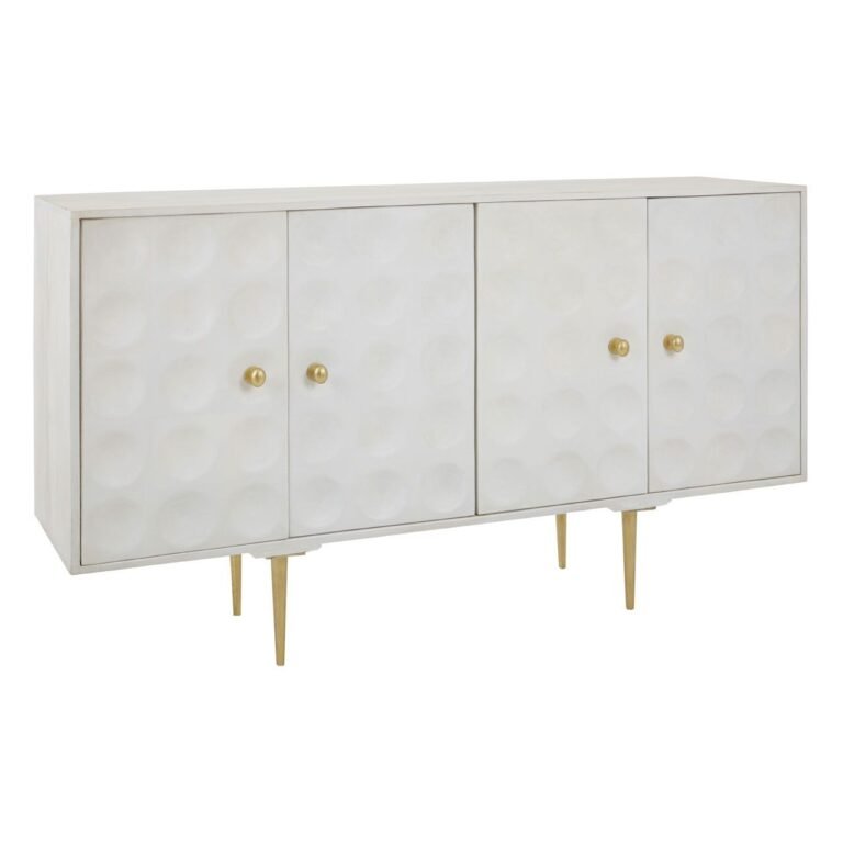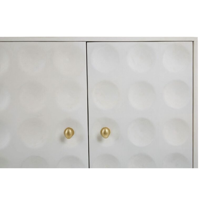 The Aska Sideboard is a sophisticated combination of storage and design. Its cabinet is crafted from renewable mango wood and sports a crisp white finish. Its angular lines are subverted by the disc-shaped indents that decorate the doors. Slim metal legs support the cabinet and are coloured gold to offer a warm contrast.