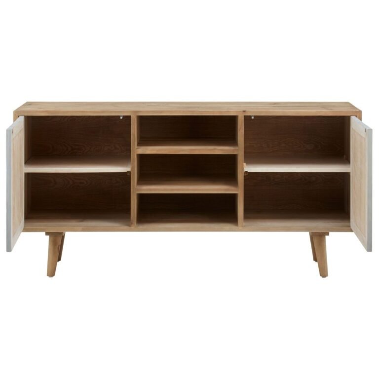 The Tapu Sideboard boasts two spacious cupboards, each with a large white door with a bevelled pattern. Shelves in the centre of the sideboard add additional storage space.